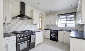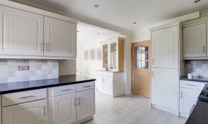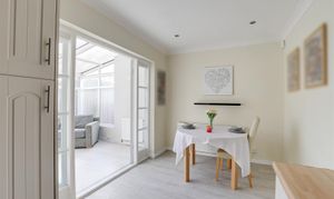 Dimensions: 6.36m x 4.10m (20'10" x 13'5"). The kitchen/diner has a range of fitted base and wall units with rolled-edge worktops, a composite sink and a half with a mixer tap and a drainer, a freestanding RangeMaster range cooker and extractor fan, an integrated fridge freezer, an integrated dishwasher, space and plumbing for a washing machine, wood-effect flooring, partially tiled walls, a radiator, coving to the ceiling, recessed spotlights, and double doors leading into the conservatory.