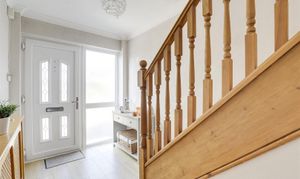 Dimensions: 4.72m x 1.96m (15'5" x 6'5"). The entrance hall has wood-effect flooring, carpeted stairs, a radiator, a built-in understairs storage cupboard, coving to the ceiling, a UPVC double-glazed obscure window to the front elevation, and a UPVC door leading into the accommodation.