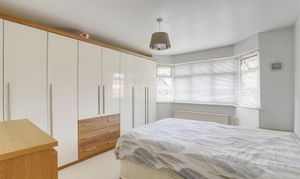 Dimensions: 4.06m x 3.49m (13'3" x 11'5"). The main bedroom has carpeted flooring, a radiator, and a UPVC double-glazed bay window to the front elevation.