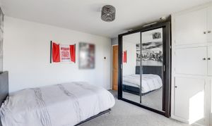 Dimensions: 3.73m x 3.49m (12'2" x 11'5"). The second bedroom has carpeted flooring, a radiator, fitted cupboards, and a UPVC double-glazed window to the rear elevation.