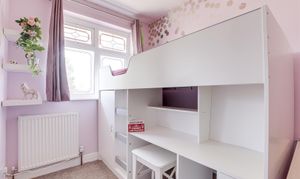 Dimensions: 2.52m x 1.96m (8'3" x 6'5"). The third bedroom has carpeted flooring, a radiator, fitted cupboards, and a UPVC double-glazed window to the rear elevation.