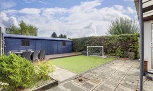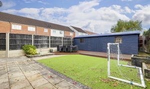 To the rear of the property is a a private enclosed garden with a paved patio area, a decked seating area, an artificial lawn, raised planters, a shed, and boundaries made up of fence panelling and hedges.