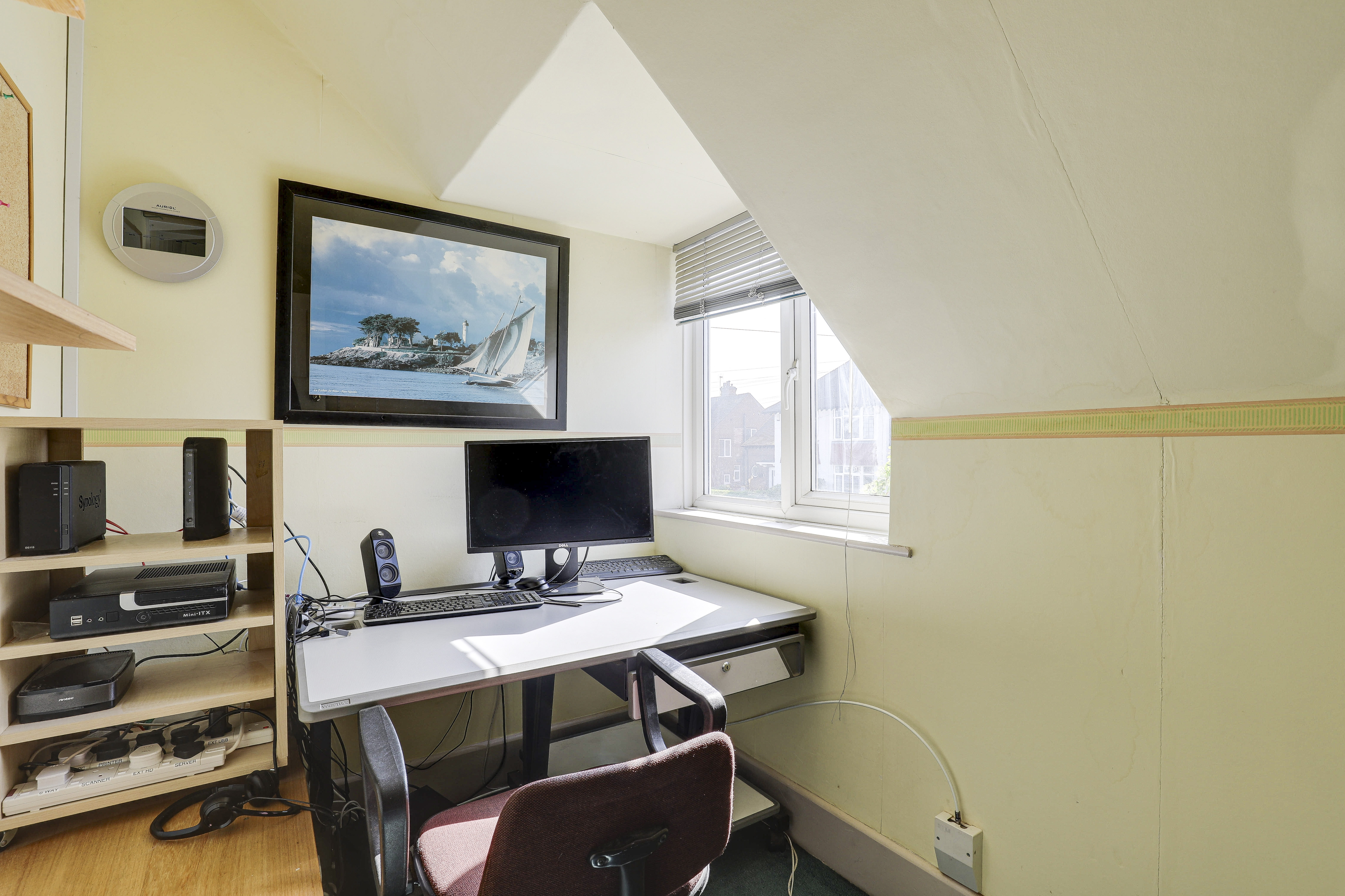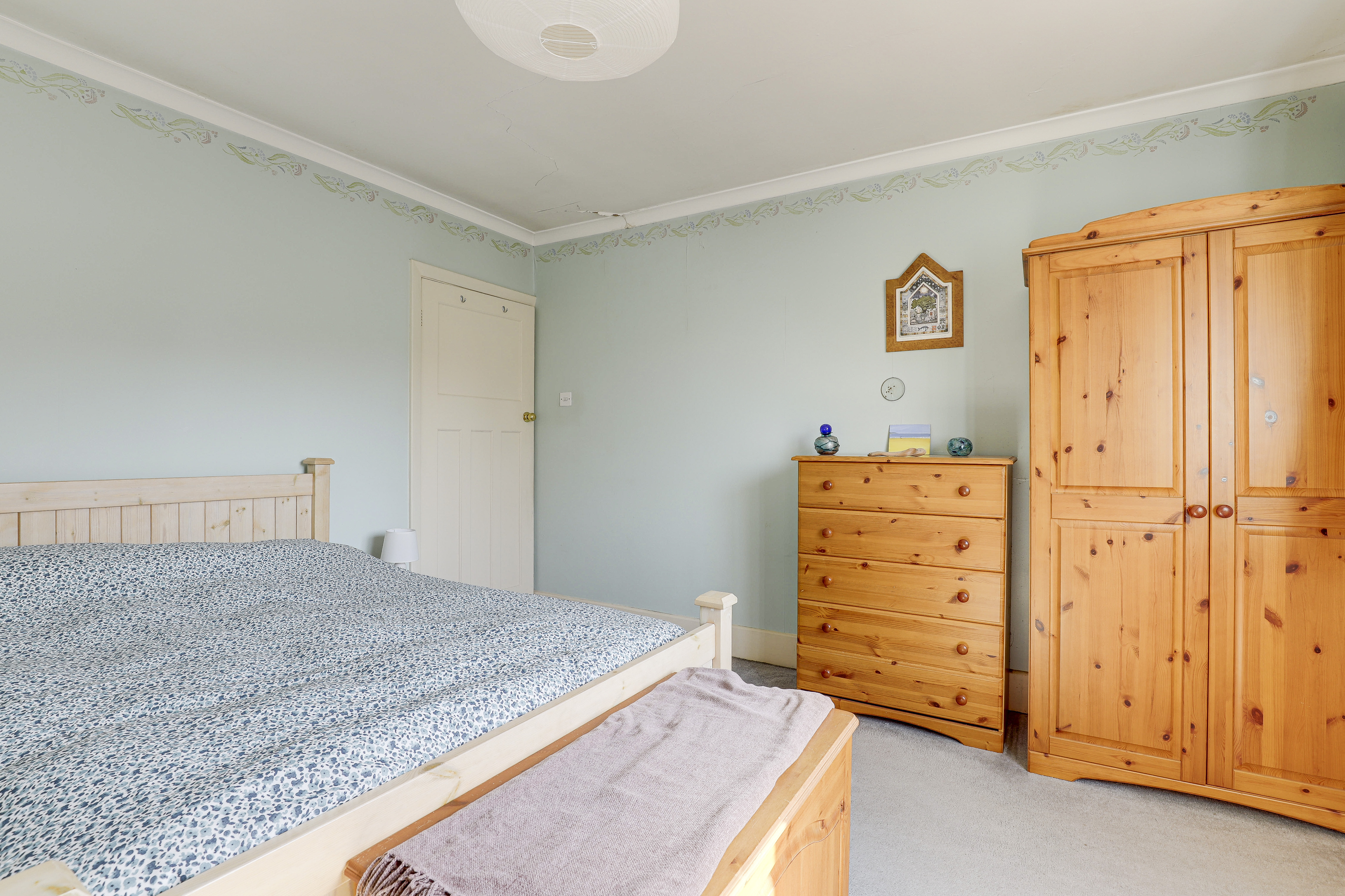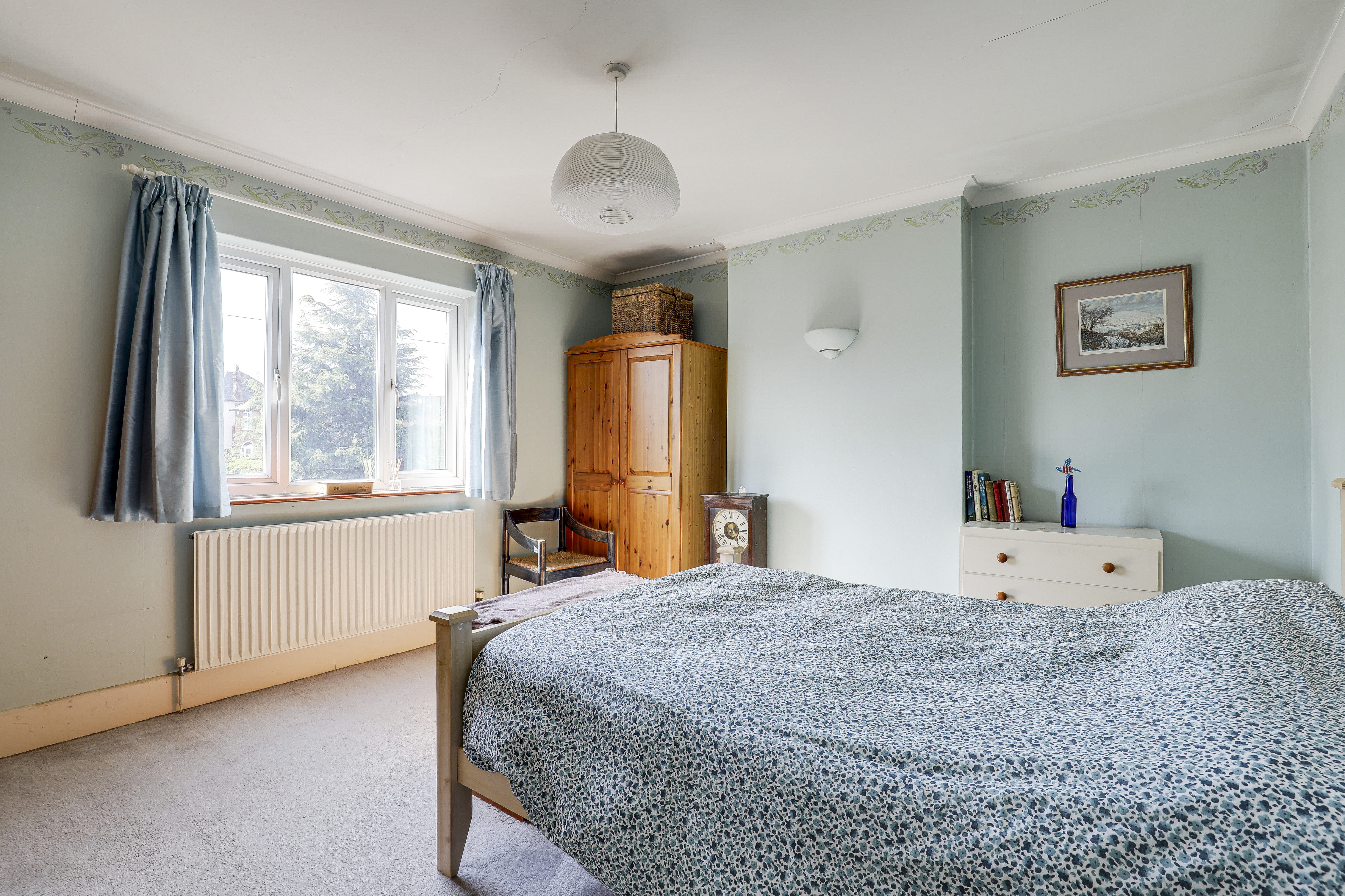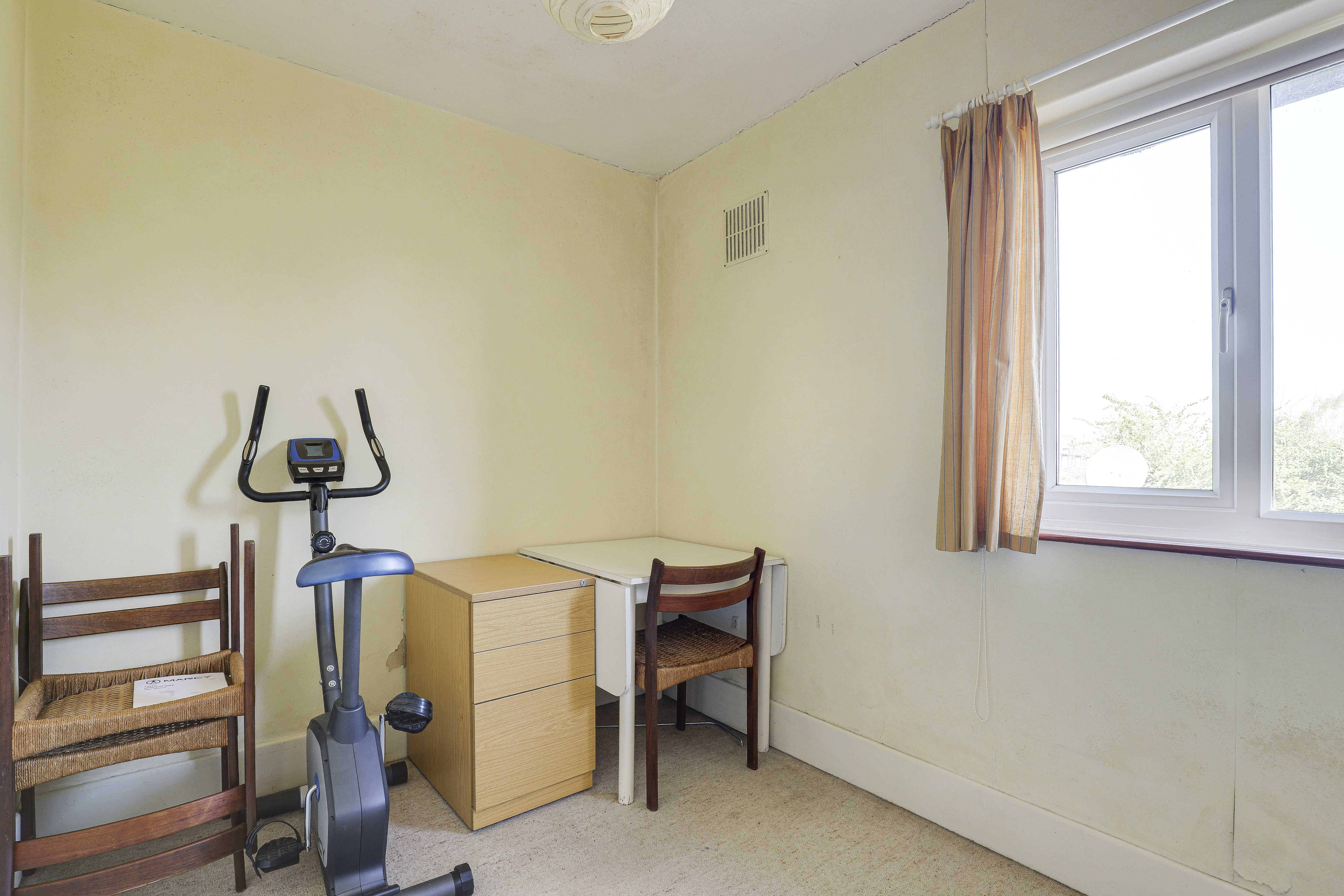 The fourth bedroom has a window to the front elevation, a radiator, and carpeted flooring.