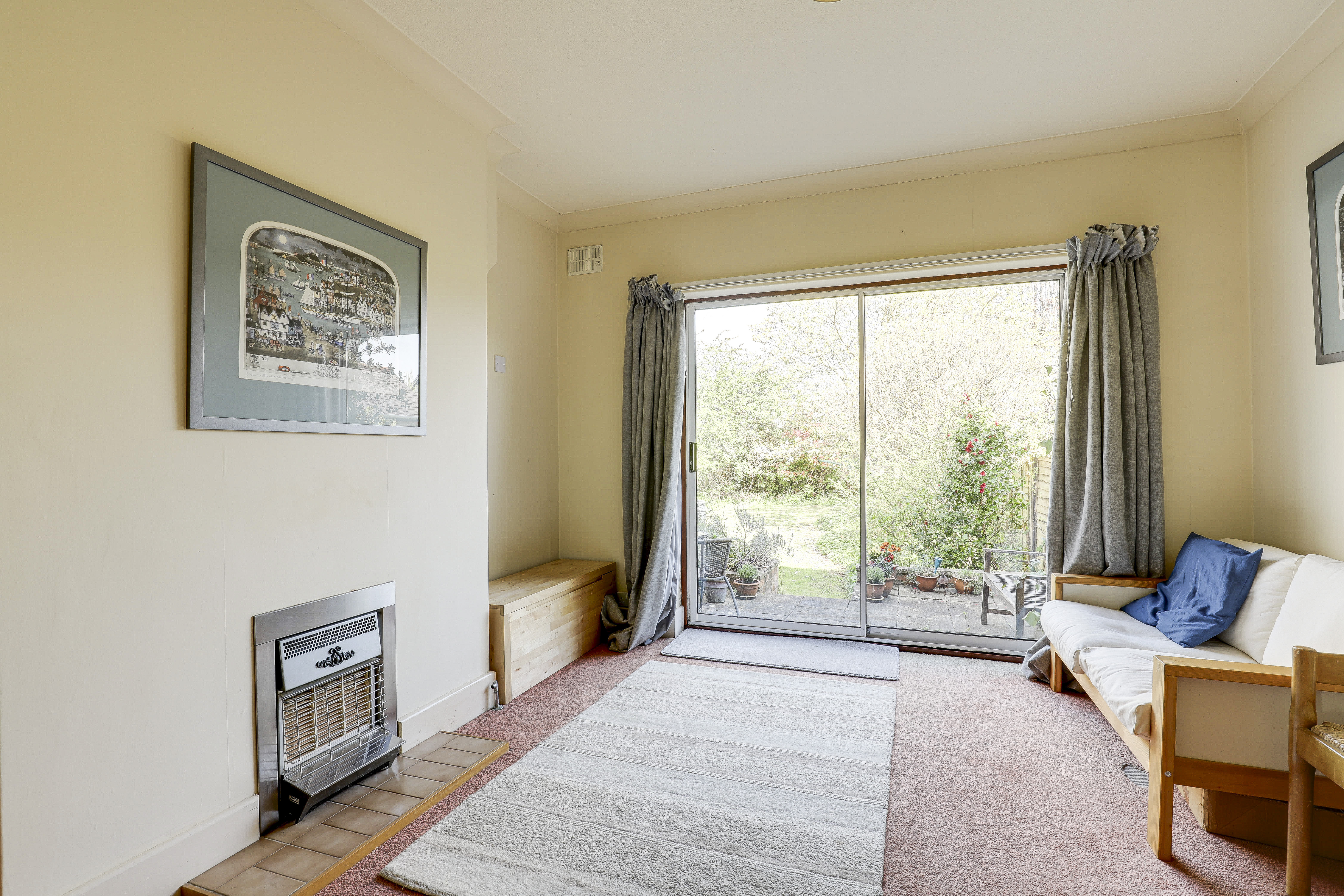 The reception room has a feature fireplace, coving to the ceiling, two radiators, carpeted flooring, and sliding doors opening to the rear garden.
