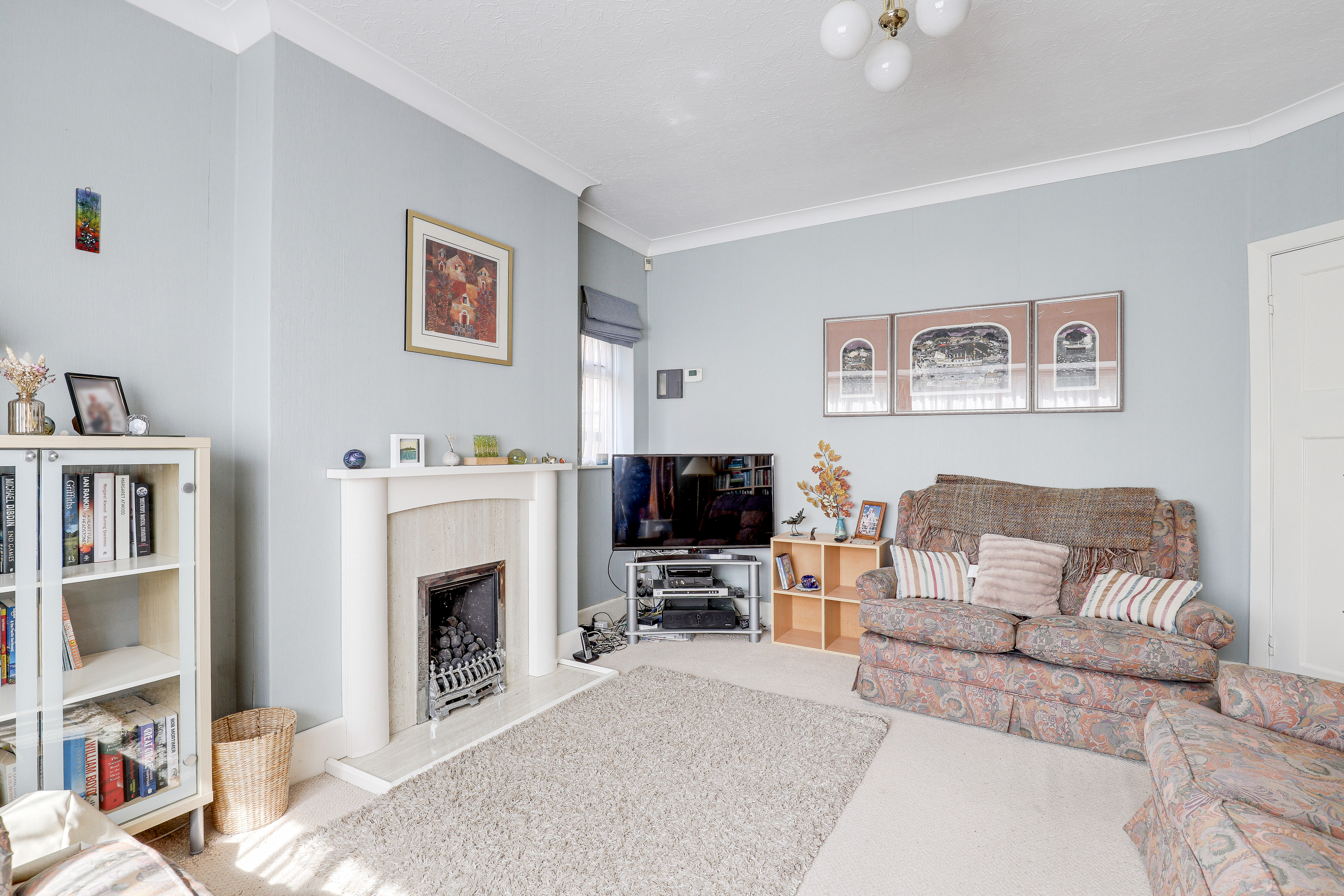 The living room has a bay window to the front elevation along with a window to the side elevation, a radiator, a feature fireplace, a TV point, coving to the ceiling, and carpeted flooring.
