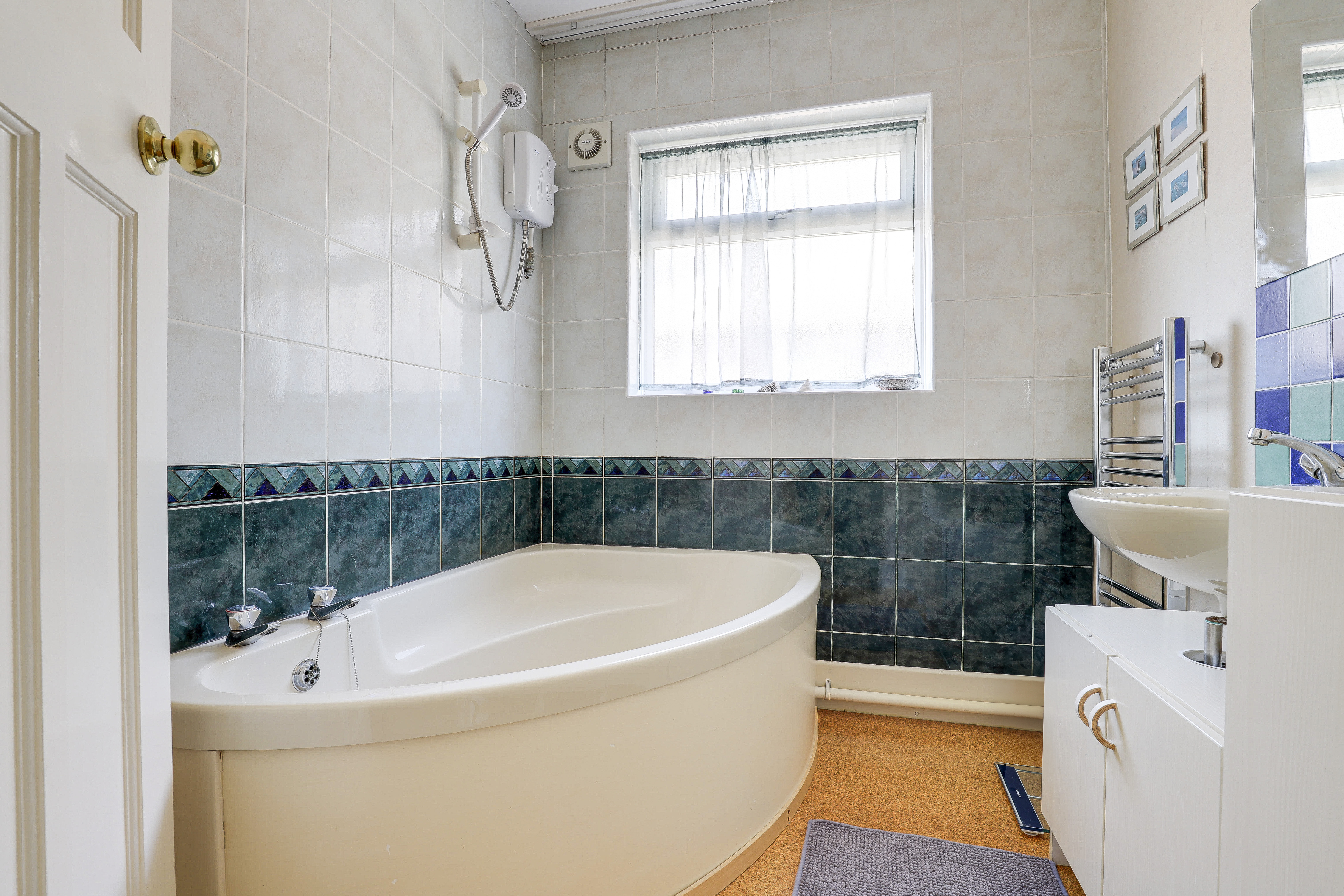 The bathroom has an obscure window to the side elevation, a counter-top wash machine, a corner bath, a shaver socket, a chrome heated towel rail, partially tiled walls, and vinyl flooring.