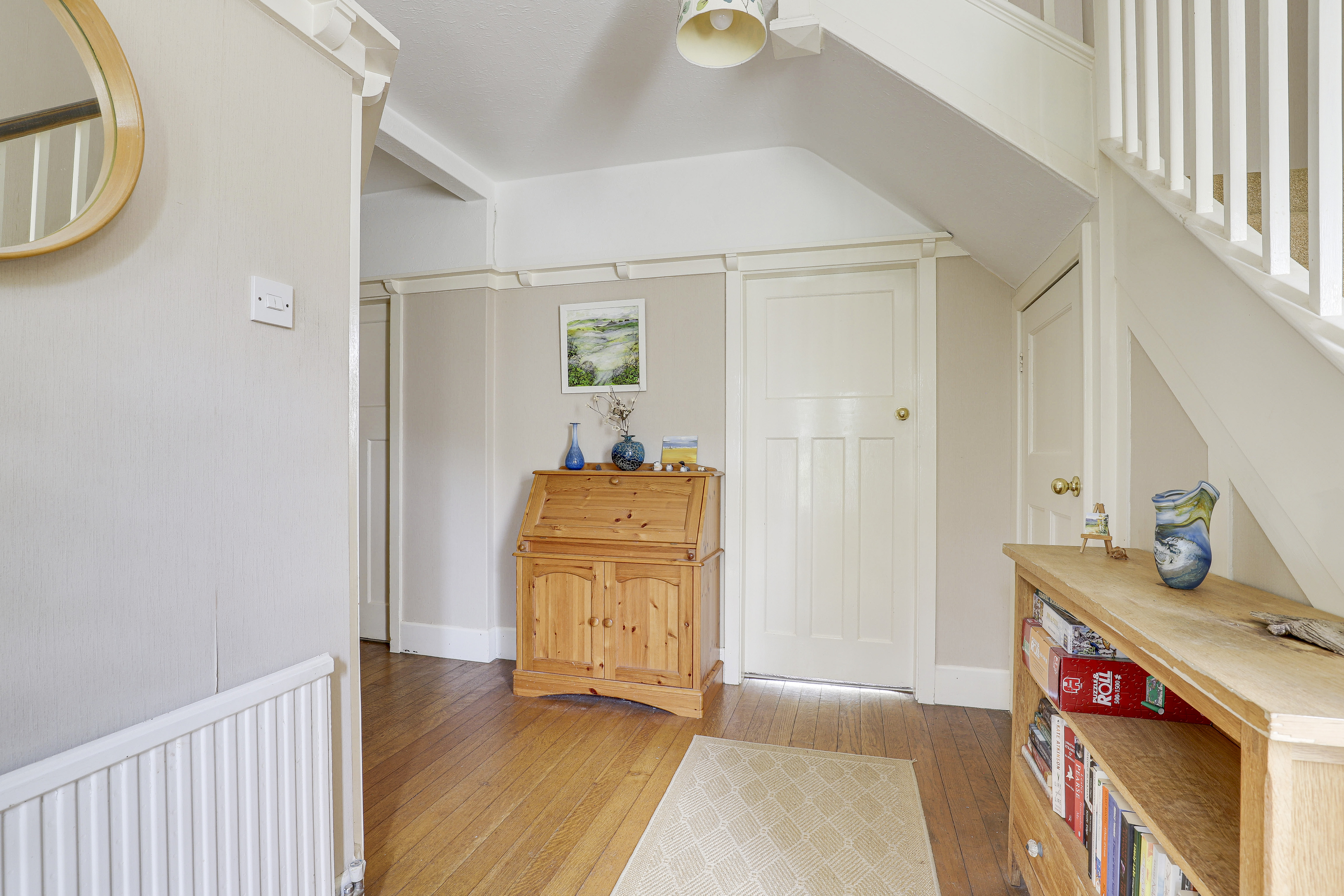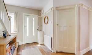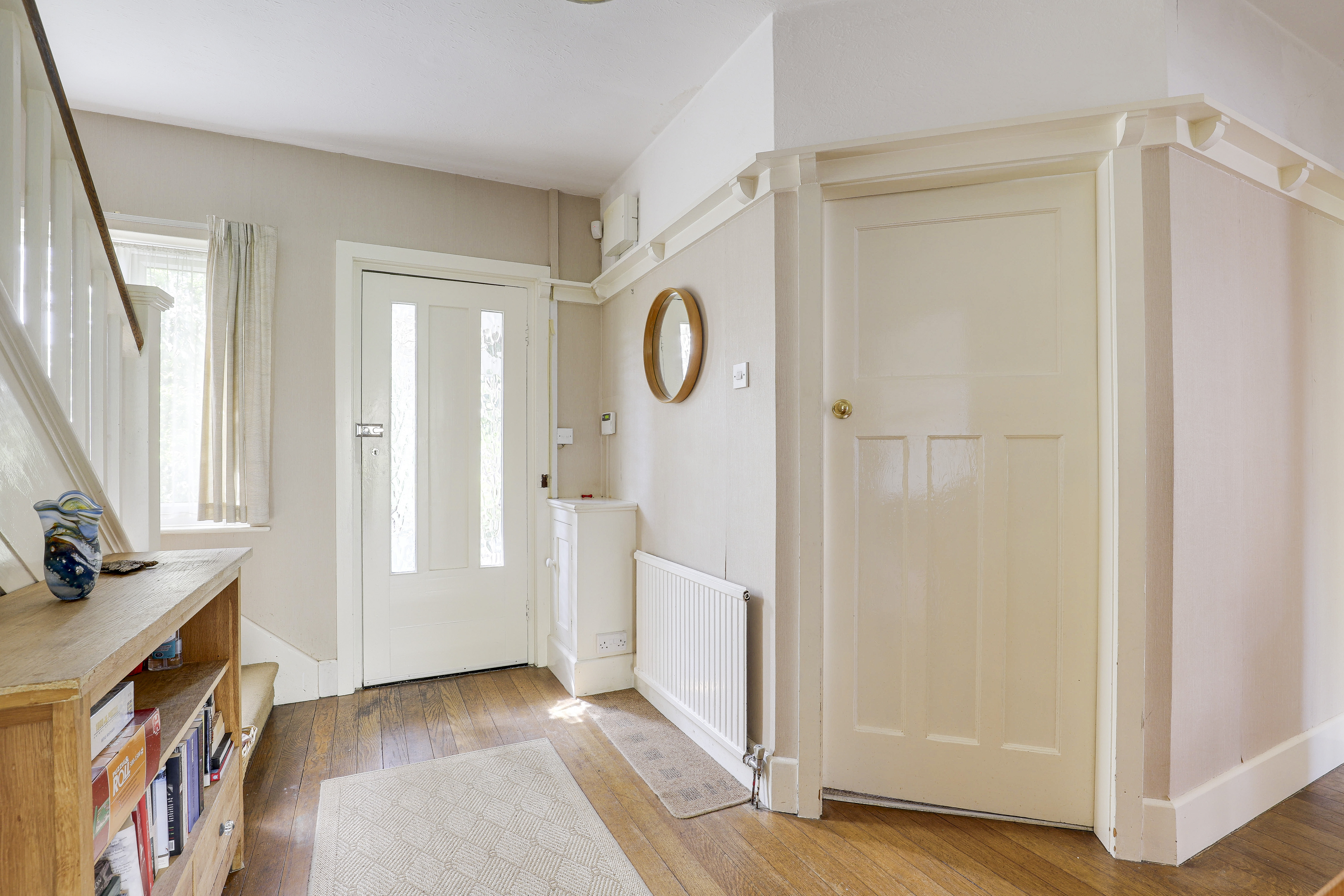 The hallway has wood flooring, carpeted stairs, a radiator, a plate rail, an in-built cupboard, a window to the front elevation, and a door providing access into the accommodation.