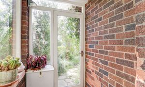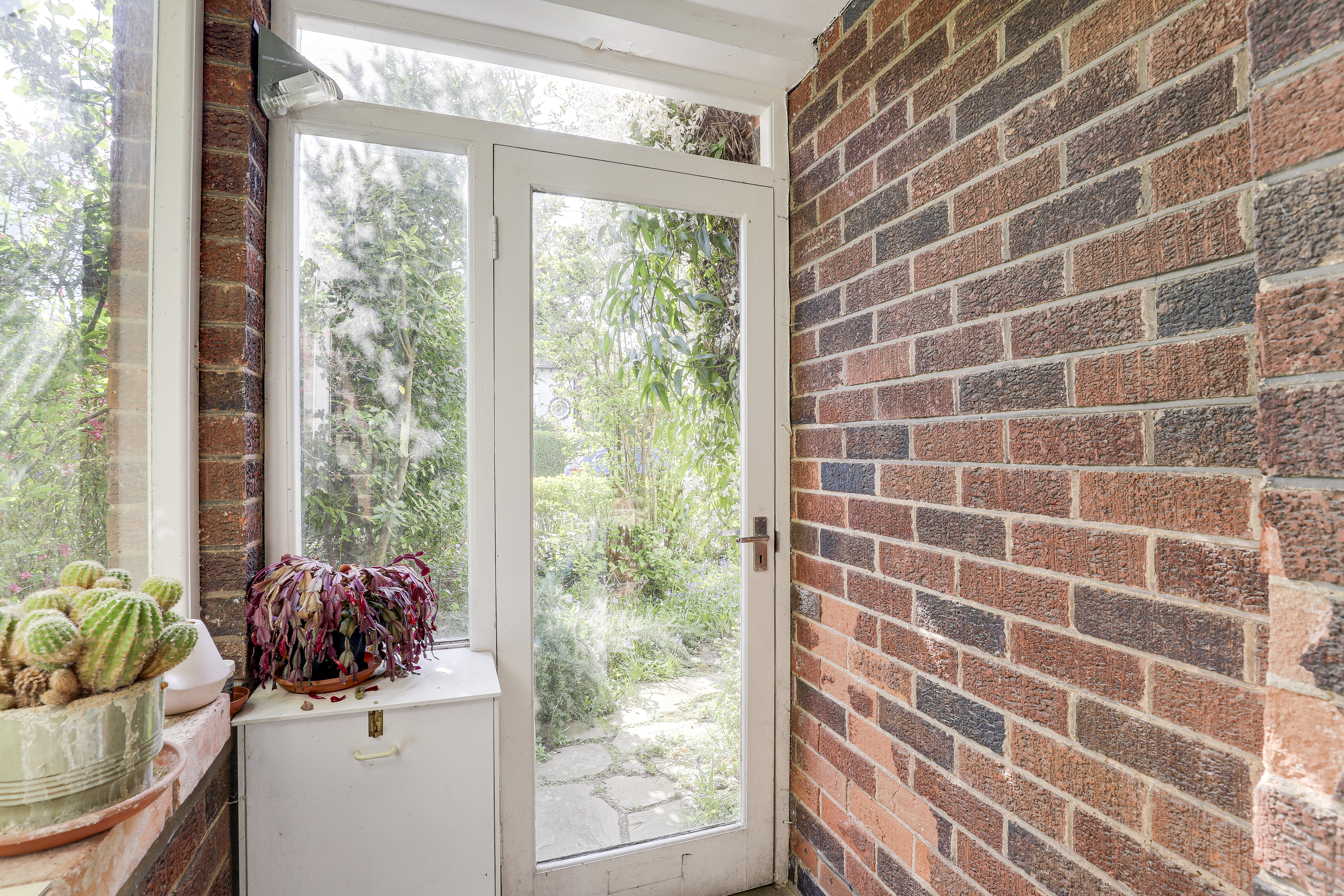 The porch has windows to the front and side elevation, exposed bricked walls, and a door opening to the front garden.