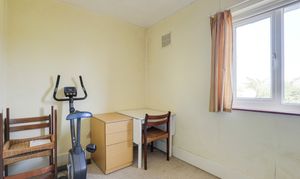 The third bedroom has a window to the rear elevation, a radiator, and carpeted flooring.