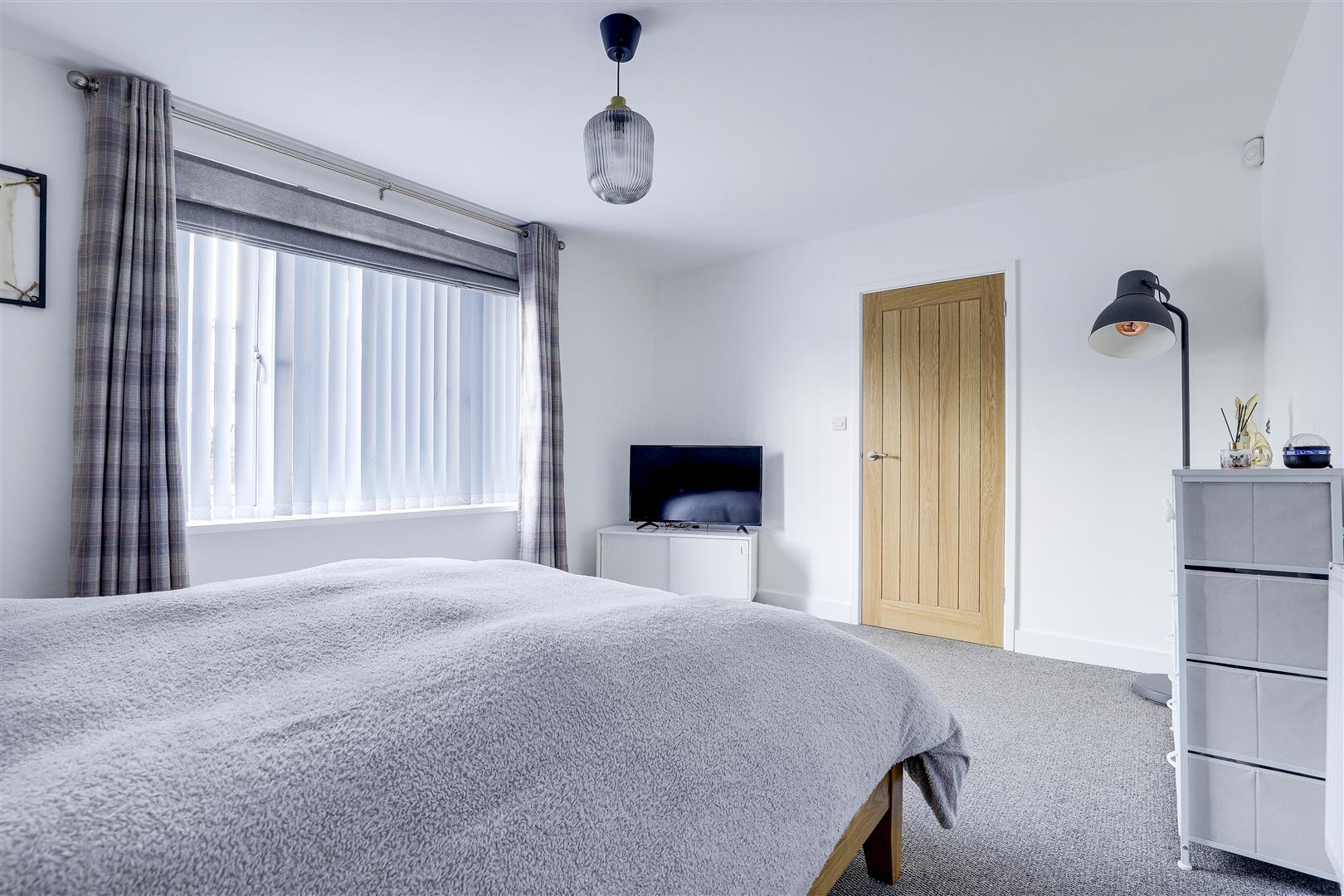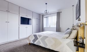 The main bedroom has carpeted flooring, a radiator, a wall of flush fitted wardrobes and overhead cupboards with space for a wall-mounted TV, and a UPVC double-glazed window to the side elevation.