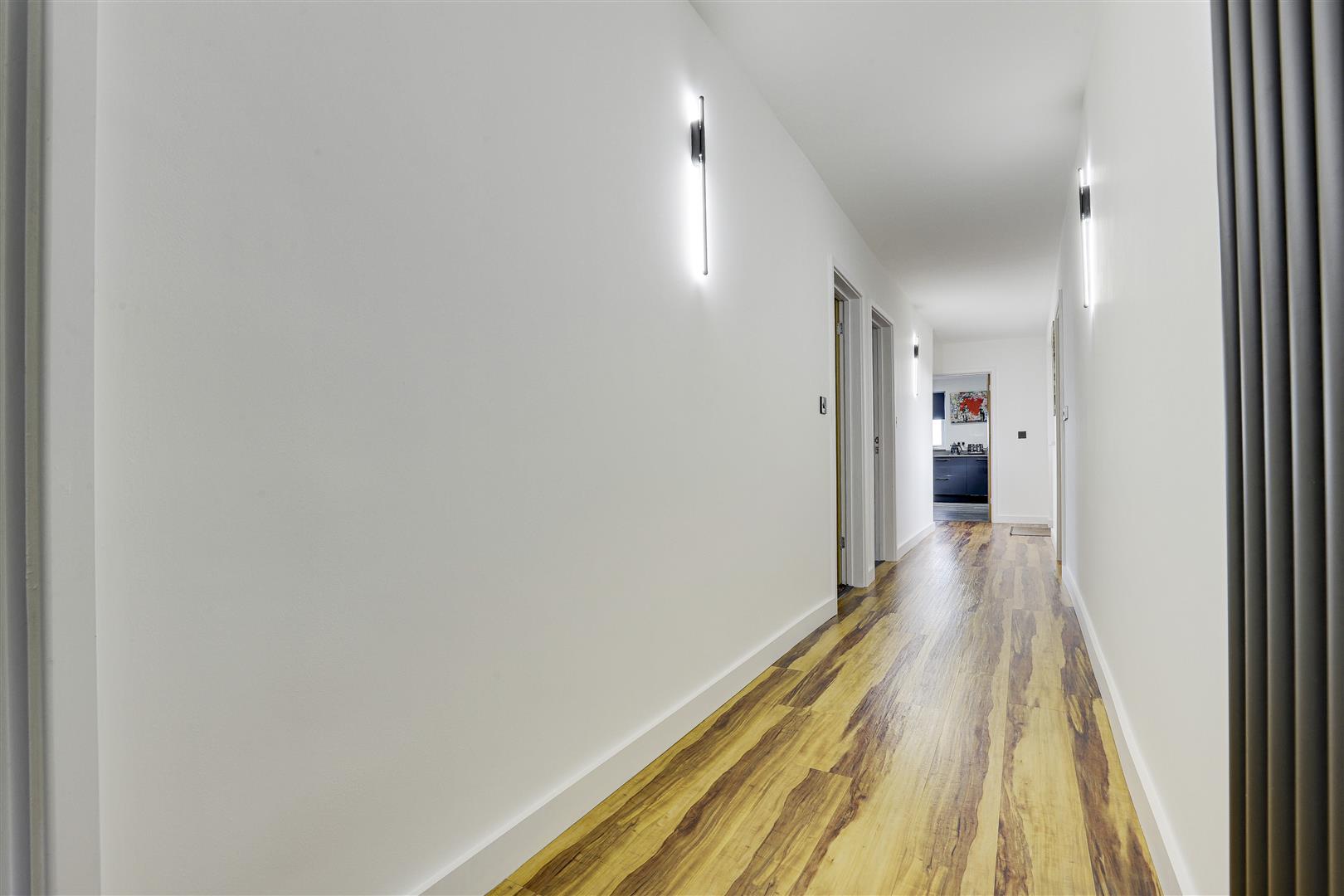 The entrance hall has LVT flooring, a vertical radiator, an open storage area, a UPVC double-glazed window to the side elevation, a UPVC door leading out to the rear garden, and a composite door providing access into the accommodation.