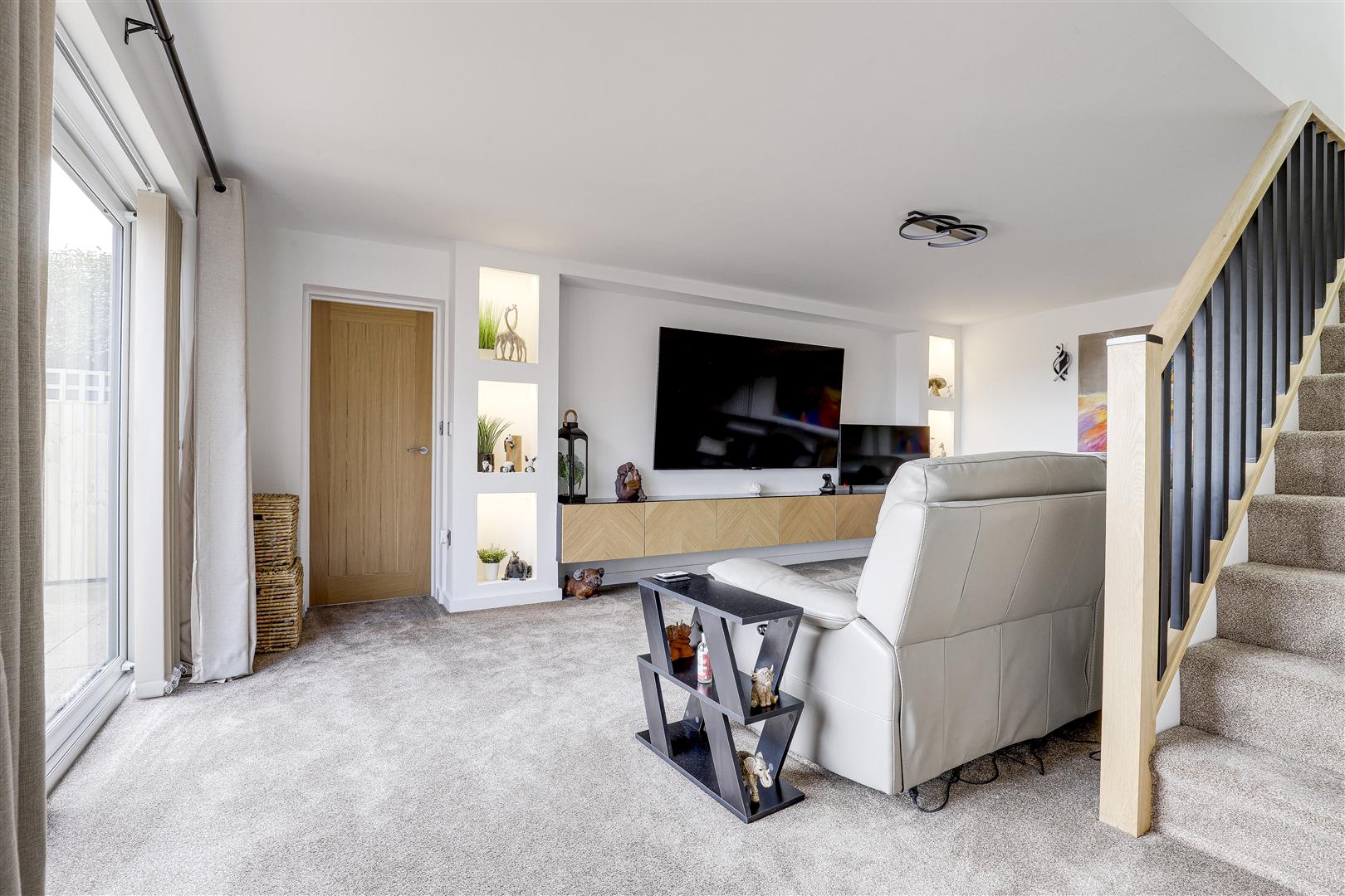 The living room has carpeted flooring and stairs, two vertical radiator, built-in shelving surrounding a media wall with spotlights, and a sliding patio door leading out to the rear garden.