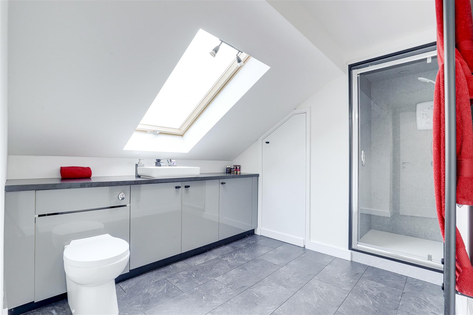 The bathroom has a concealed low level flush W/C, a countertop wash basin with a mixer tap, a shower enclosure with a wall-mounted handheld shower fixture, tiled flooring, built-in storage, access to the boiler and a large storage area, a heated towel rail, recessed spotlights, and a Velux window.