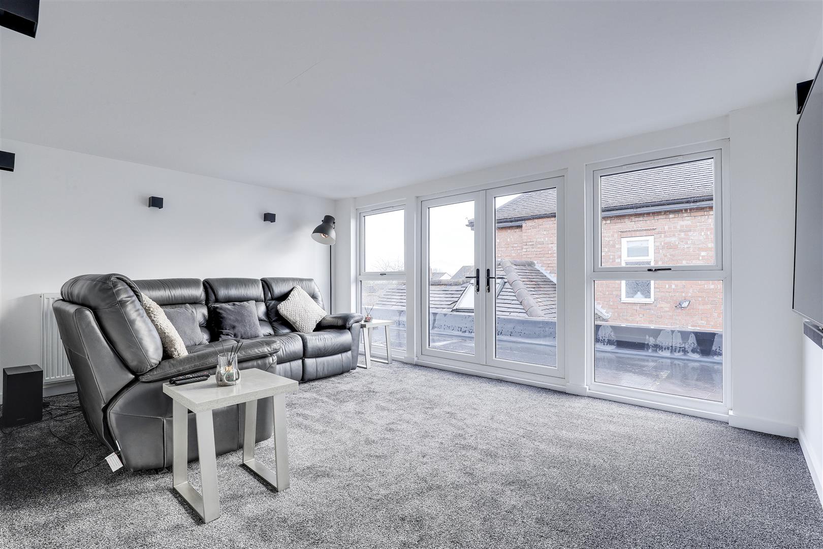 This versatile bedroom has carpeted flooring, a radiator, UPVC double-glazed windows to the side elevation, and double French doors leading out onto the terrace.