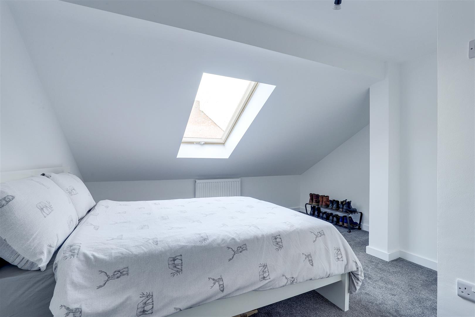 The fifth bedroom has carpeted flooring, a radiator, eaves storage, and a Velux window.