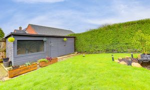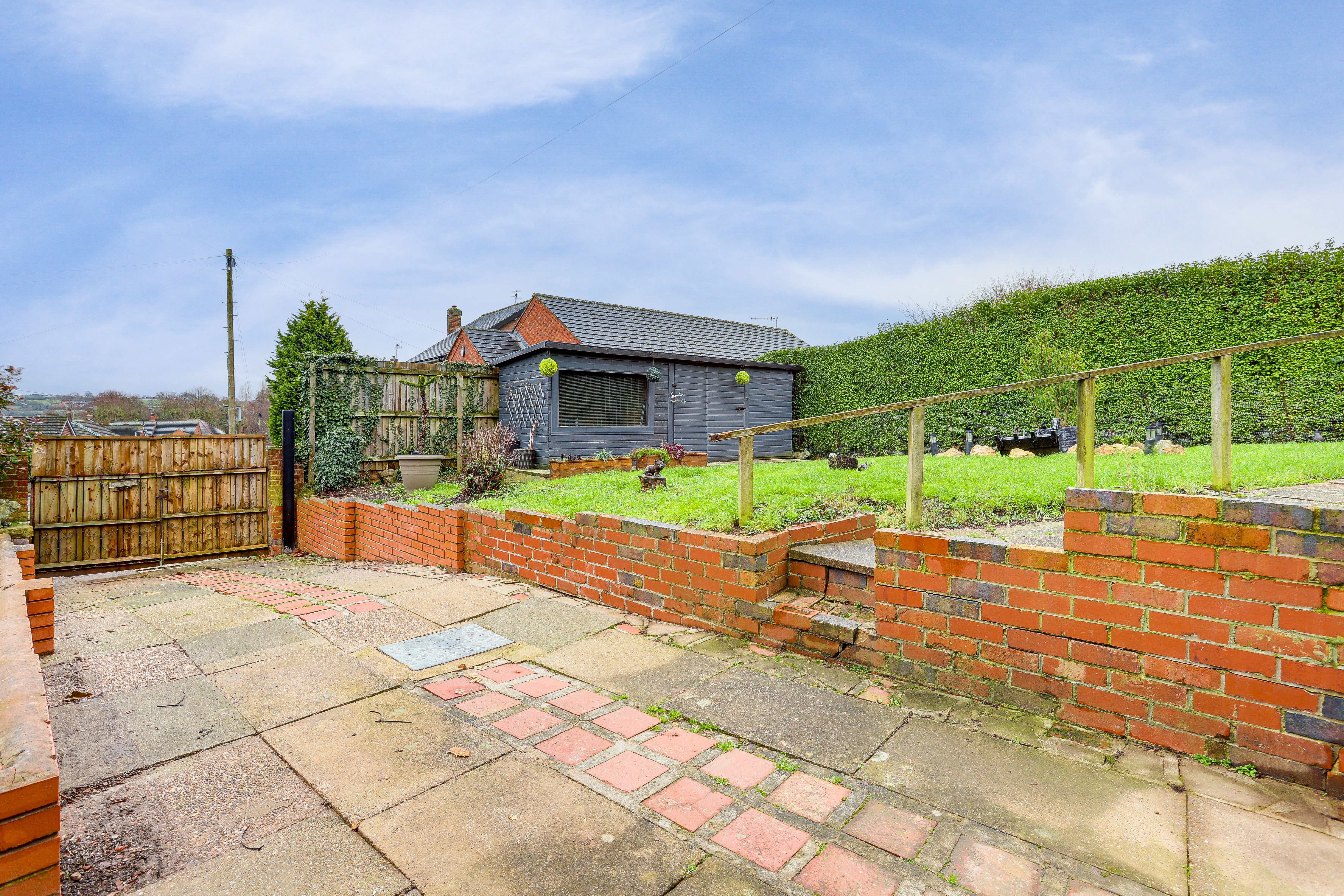 To the rear of the property is a private enclosed garden with a paved patio seating area, a lawn, a gated driveway providing secure off-street parking, a large shed, and boundaries made up of hedges and fence panelling.