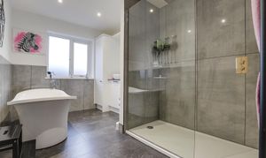 The bathroom has a concealed low level flush W/C, a countertop wash basin with a mixer tap, a freestanding bath with a floor-mounted tap and shower, a walk-in shower enclosure with a ceiling-mounted overhead shower and a wall-mounted handheld shower fixture, tiled flooring, partially tiled walls, built-in storage, a heated towel rail, recessed spotlights, an extractor fan, and a UPVC double-glazed obscure window to the side elevation.