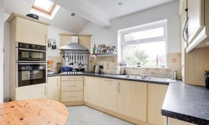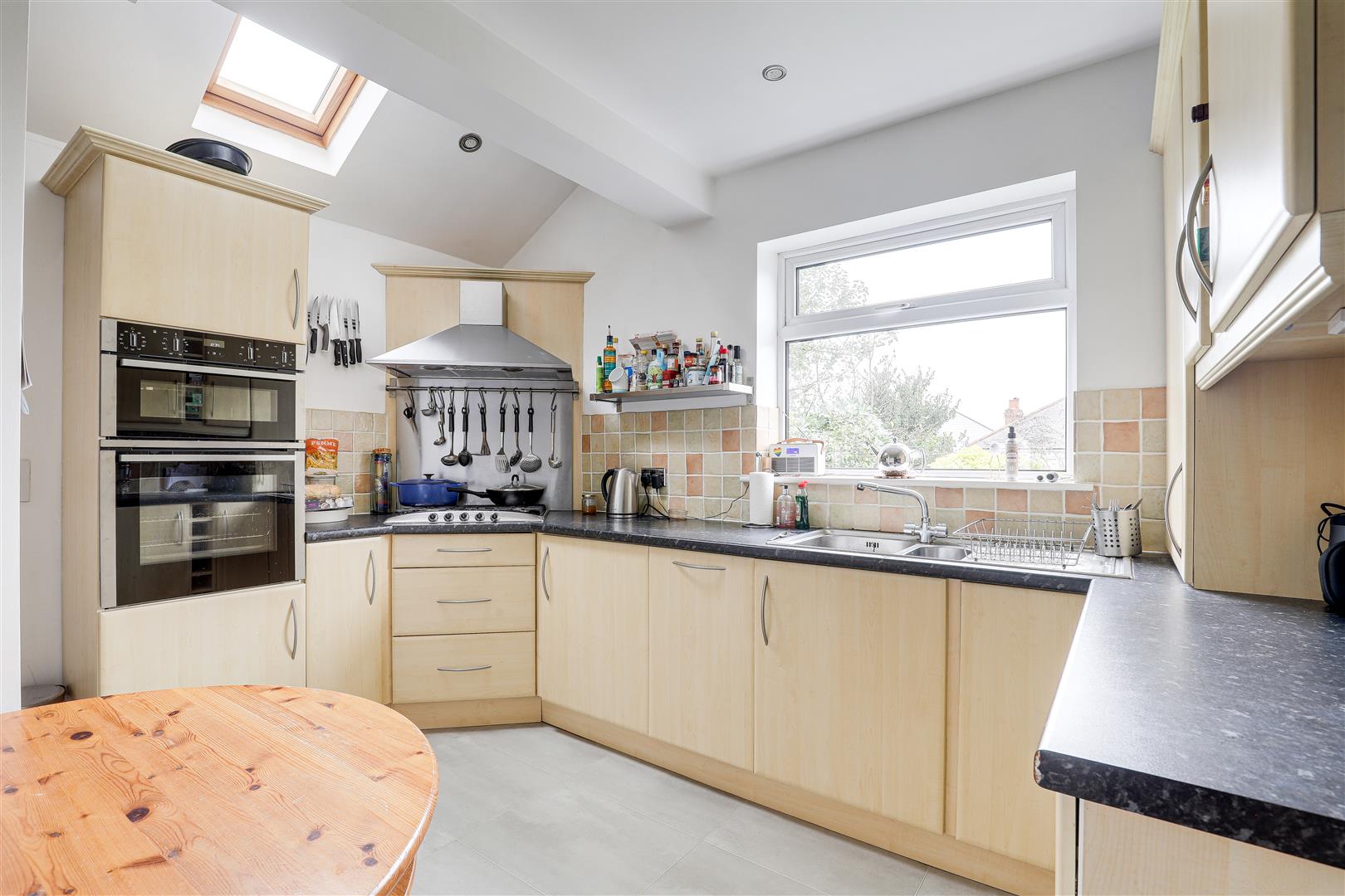 The kitchen has a range of fitted base and wall units with worktops, a stainless steel sink and a half with a drainer and a mixer tap, an integrated double oven, an integrated gas hob, an extractor hood, an integrated dishwasher, tiled splashback, a radiator, recessed spotlights, a Velux window and a UPVC double glazed window to the rear elevation.