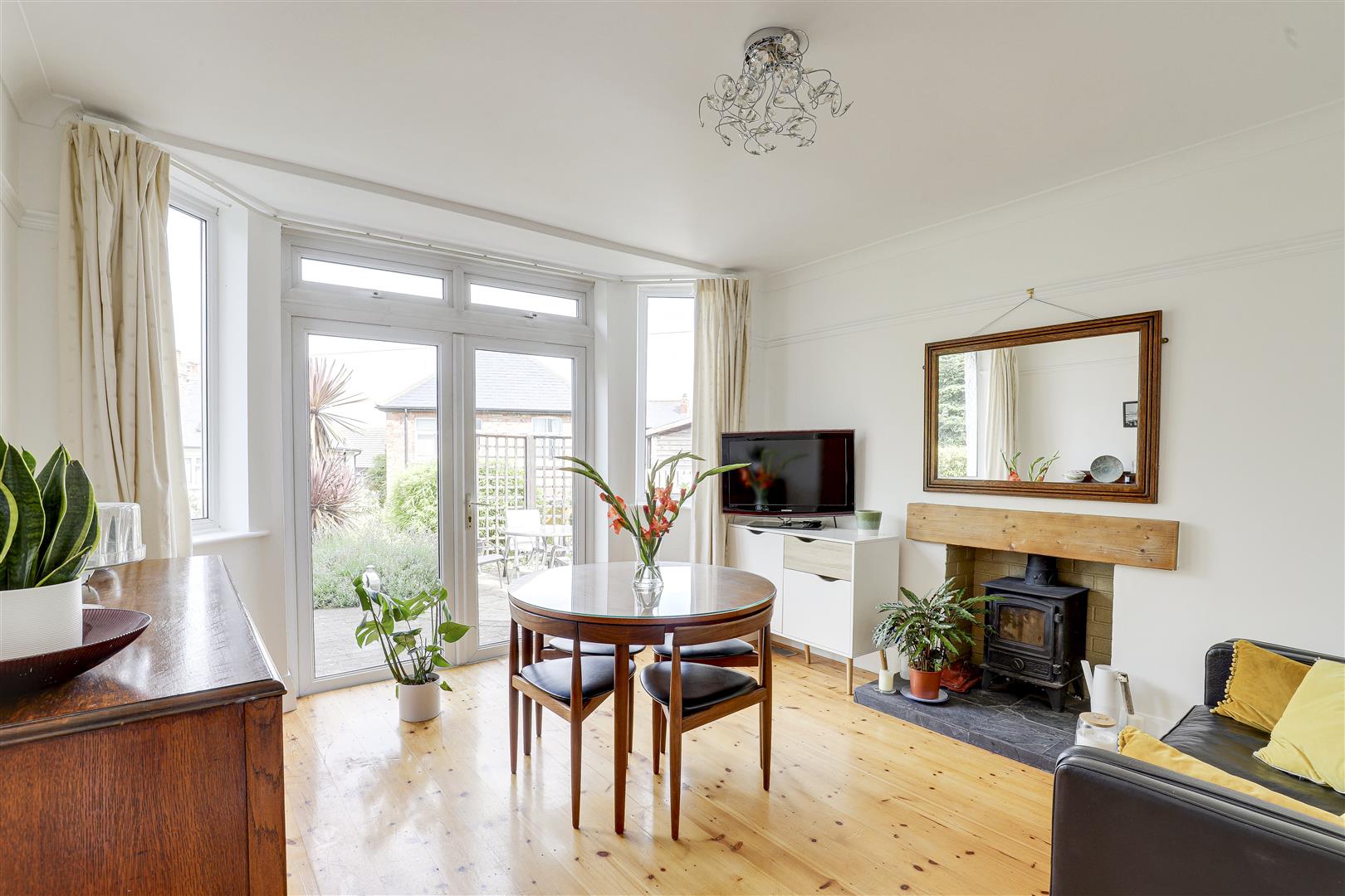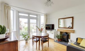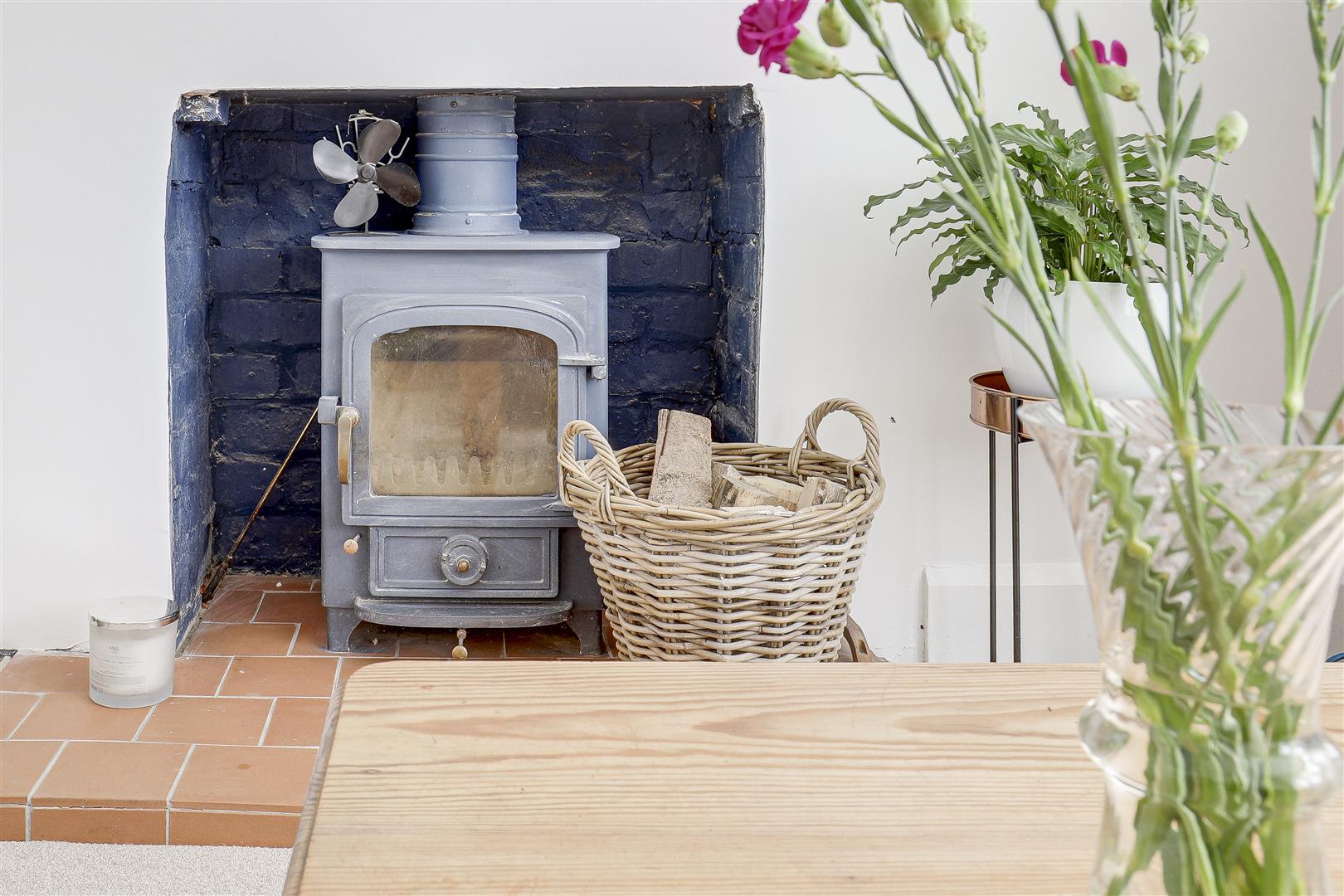 The dining room has wooden flooring, a feature log burner with a hearth and a wooden mantlepiece, a TV point, a radiator, a picture rail, two UPVC double glazed windows to the rear elevation and UPVC double French doors providing access to the rear garden.
