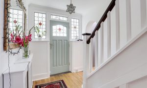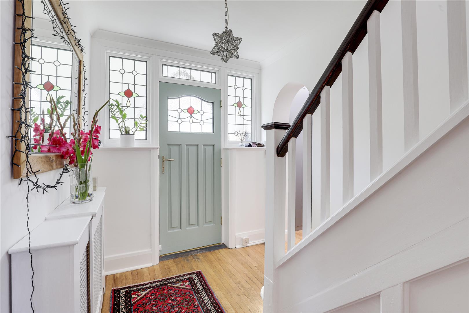 The entrance hall has wooden flooring, carpeted stairs, a radiator, coving to the ceiling, two windows with stained glass inserts and a single door with a stained glass insert to the front elevation.