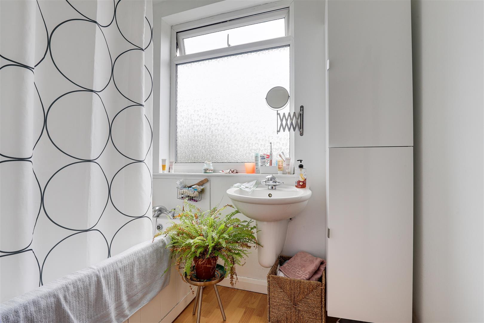 The bathroom has a pedestal wash basin, a panelled bath, a heated towel rail, partially tiled walls, recessed spotlights and a UPVC double glazed obscure window to the rear elevation.