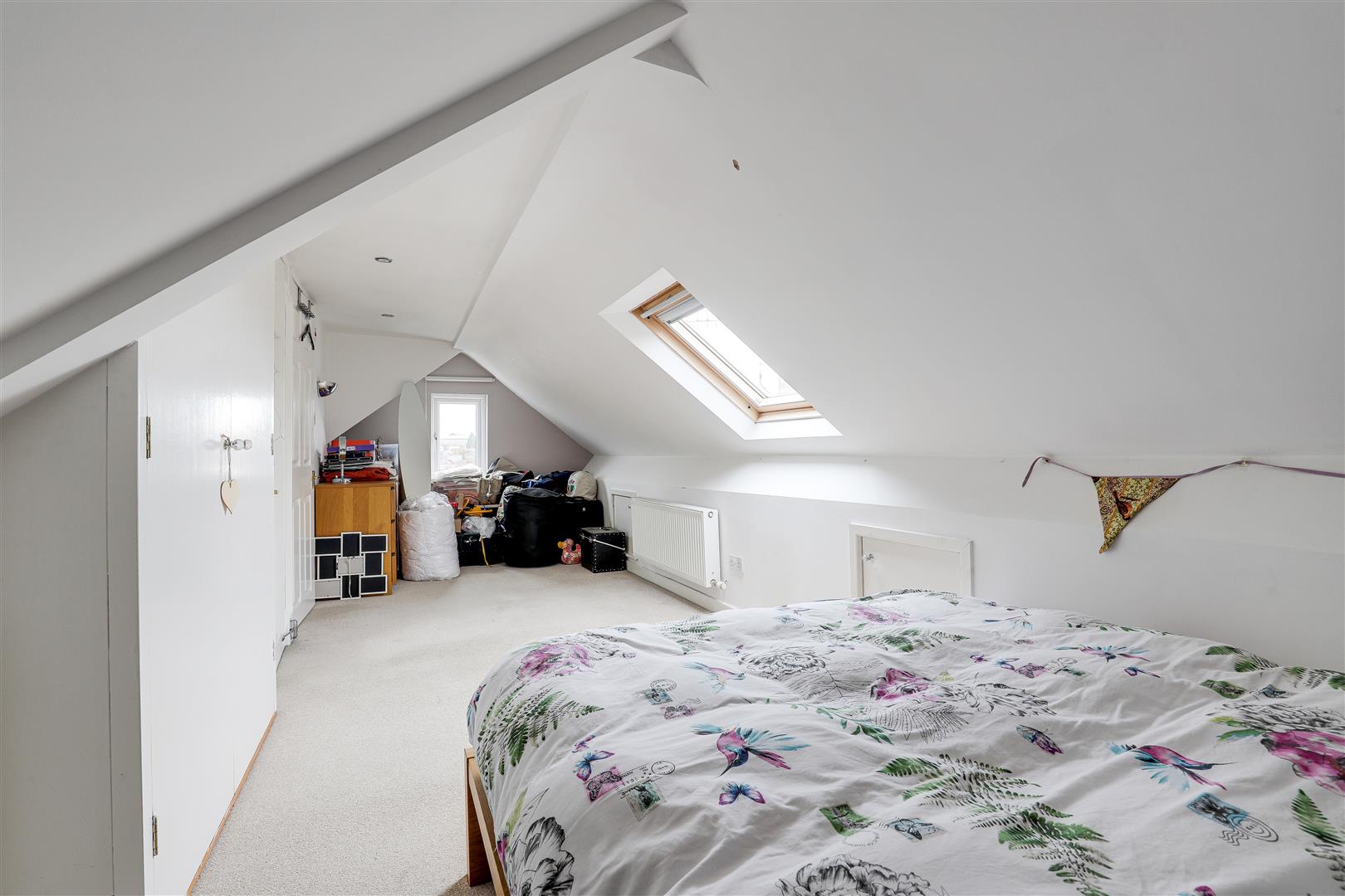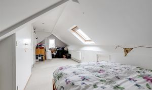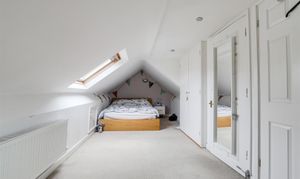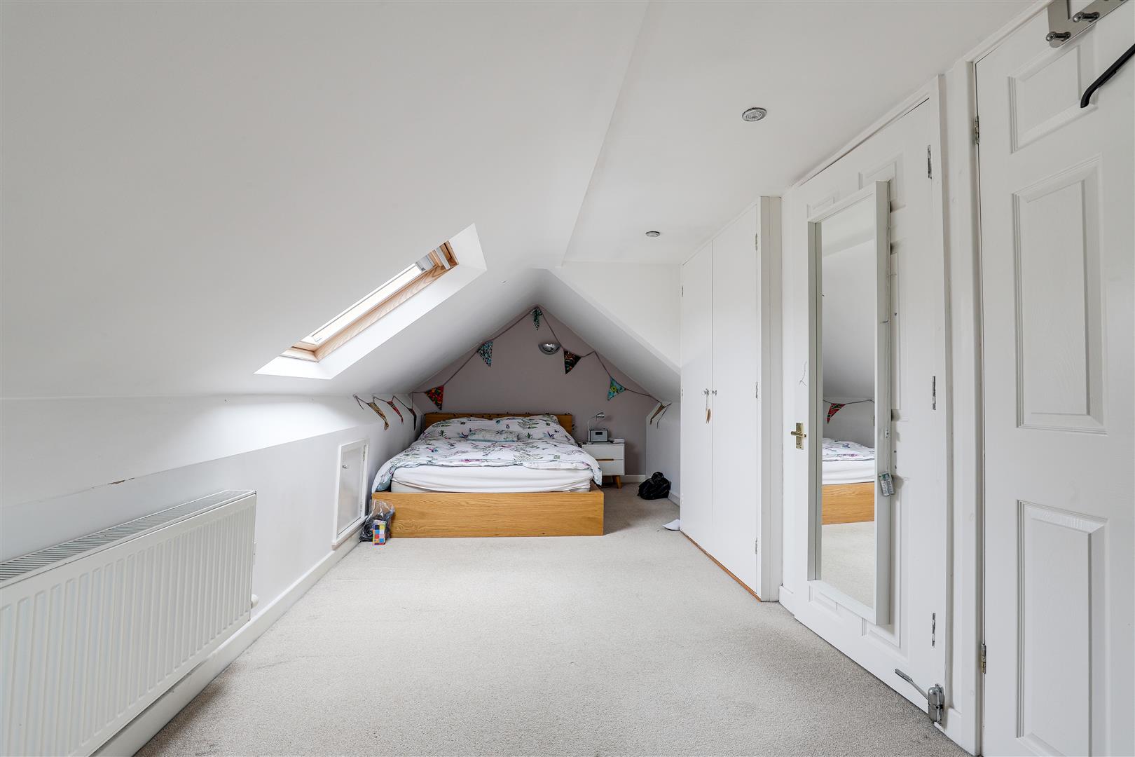 The master bedroom has carpeted flooring, an in-built wardrobe, storage in the eaves, a radiator, recessed spotlights, a Velux window and a UPVC double glazed window to the rear elevation.