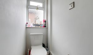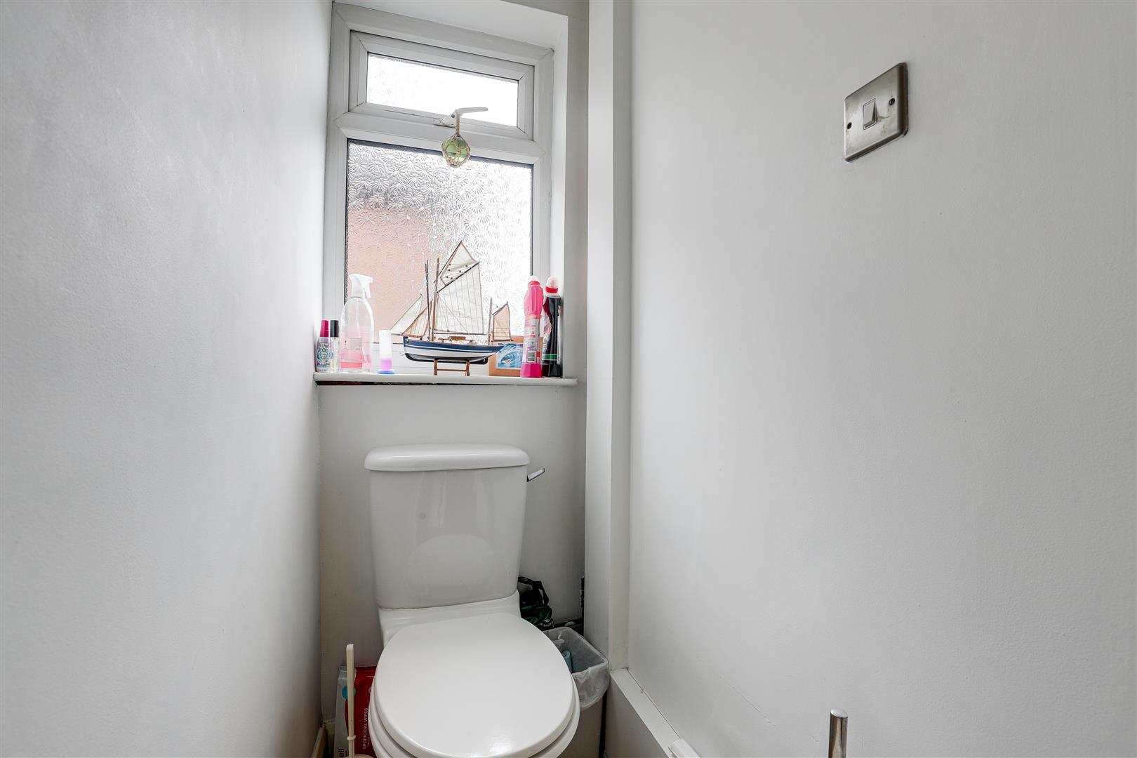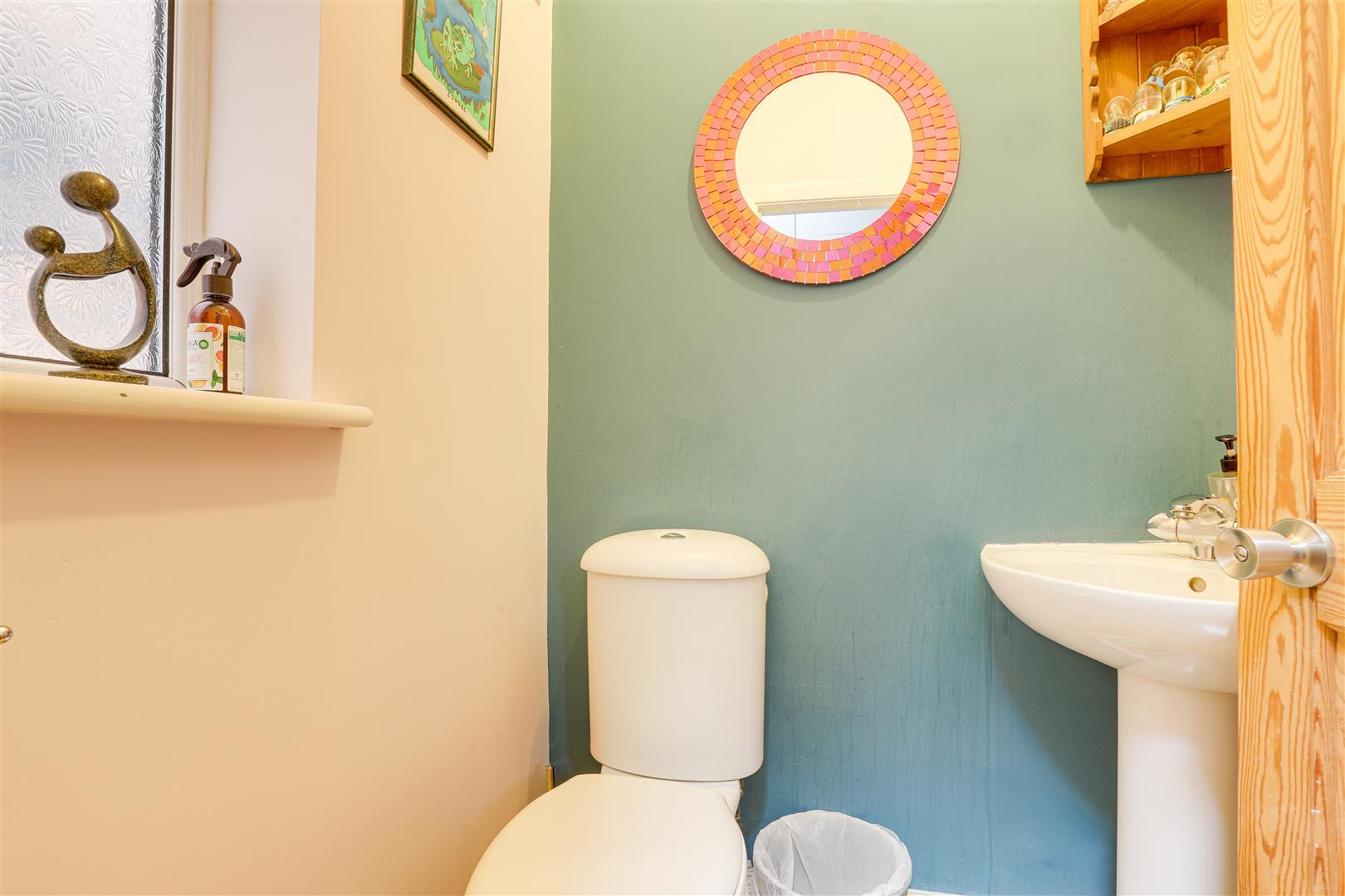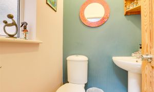 This space has a low-level dual flush W/C, a pedestal wash basin with a stainless steel mixer tap, wooden flooring and a UPVC double glazed obscure window to the side elevation.