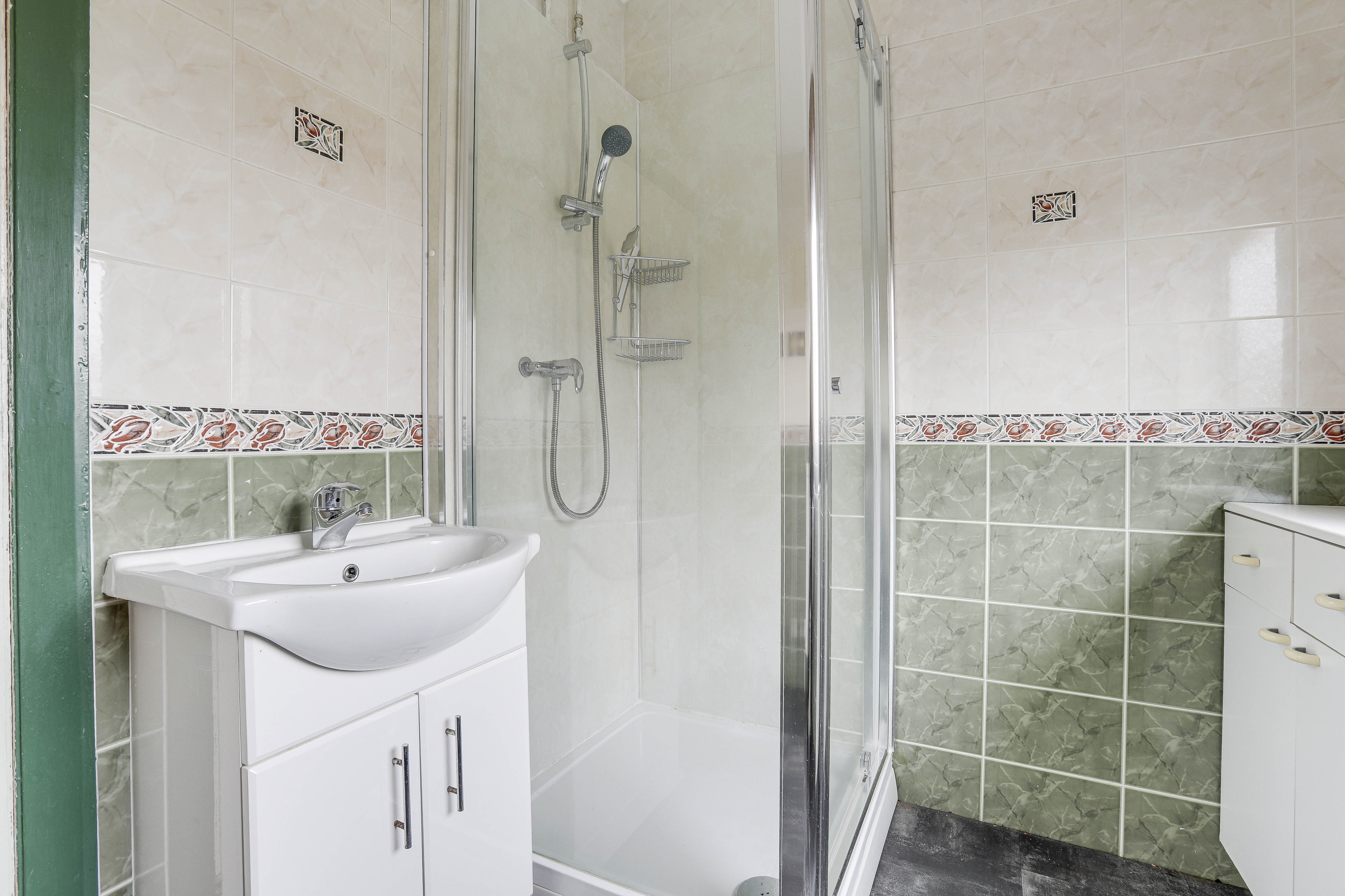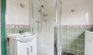 The bathroom has a low level flush W/C, a vanity style wash basin, a fitted shower enclosure with a mains-fed shower, tiled flooring and walls, a radiator and a UPVC double-glazed obscure window to the rear elevation.