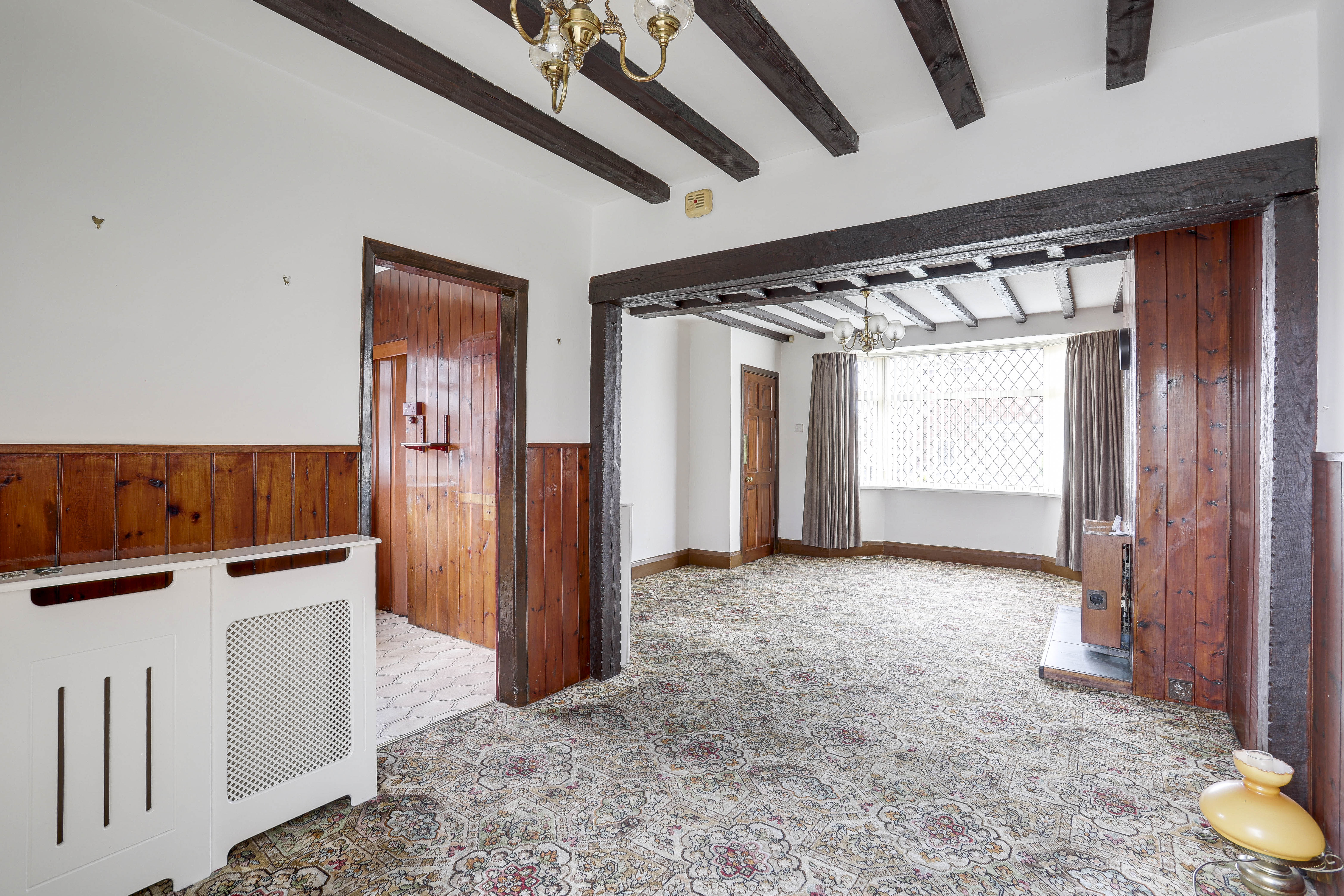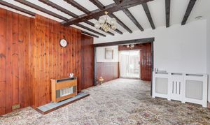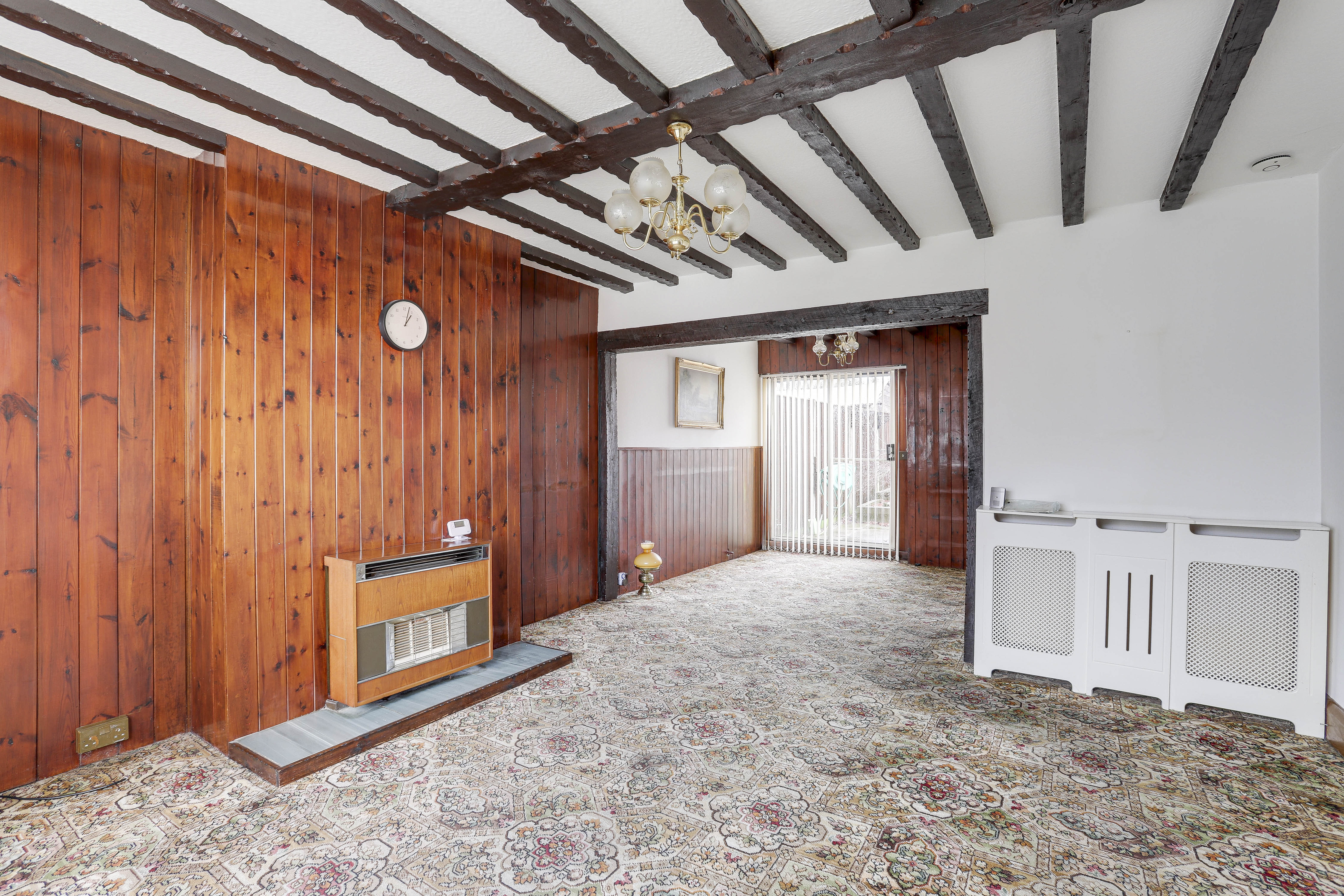 The living room has a UPVC double-glazed bay window to the front elevation, carpeted flooring, a radiator, a gas fireplace, partially wood-panelled walls, wooden beams to the ceiling and open access into the dining room.