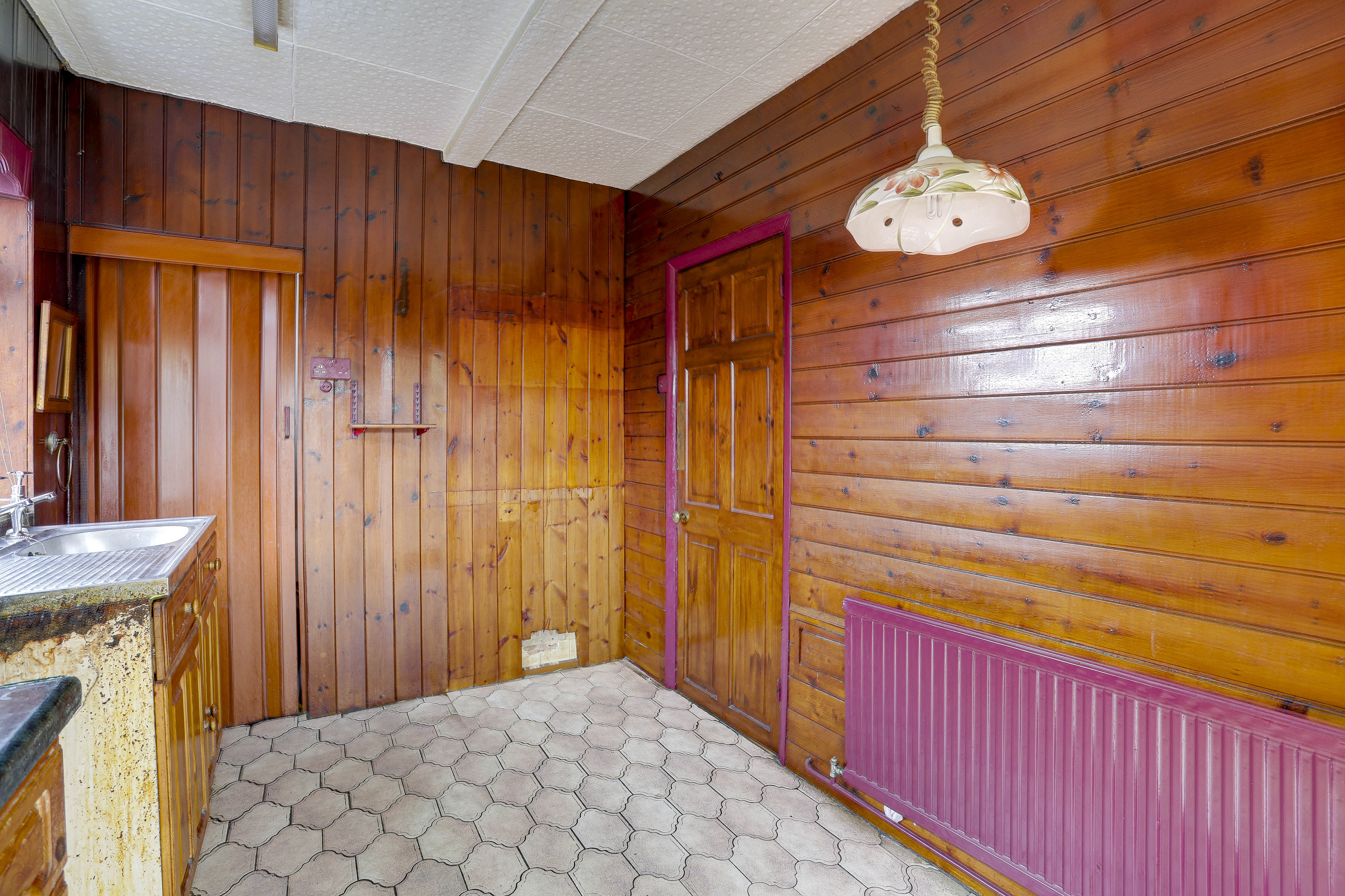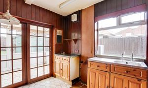 The kitchen has a range of fitted base units with worktops, space for a freestanding cooker, a stainless steel sink with a drainer, vinyl flooring, a radiator, wood-panelled walls, a built-in cupboard, an extractor fan, a UPVC double-glazed window to the side elevation and sliding patio doors providing access into the conservatory.