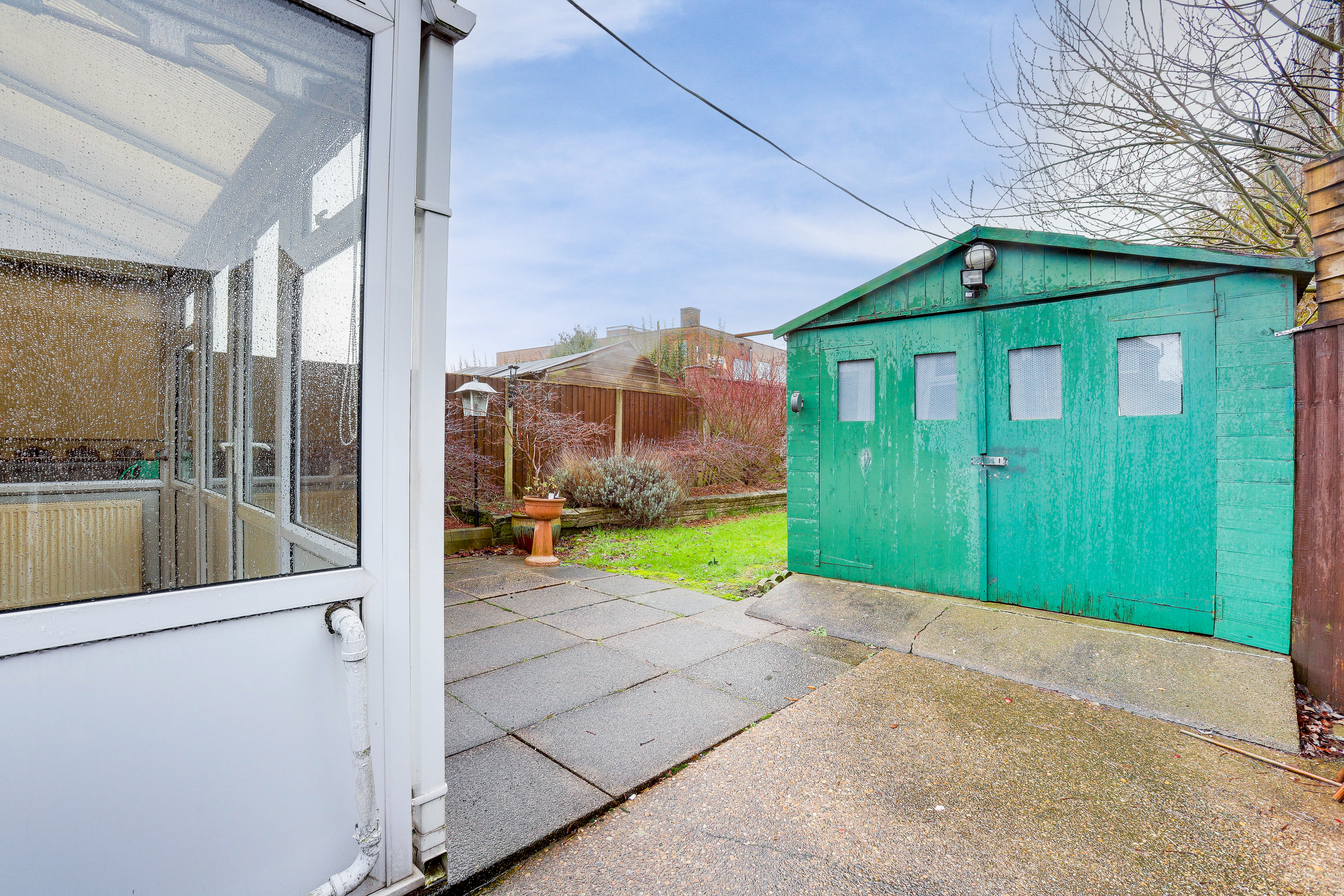 To the rear is a private garden with a paved patio seating area, a lawn, mature shrubs and trees, an outbuilding and fence-panelled boundaries.