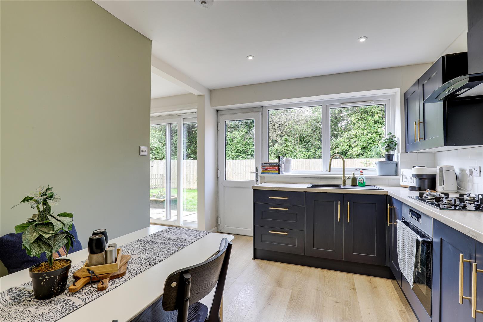 The kitchen has a range of fitted shaker style base and wall units with worktops, an integrated oven, a gas hob with an extractor hood, a stainless steel with a drainer and a swan neck mixer tap, space and plumbing for a dishwasher, space for a fridge-freezer, space for a dining table, laminate flooring, partially tiled walls, a vertical radiator, recessed spotlights, a UPVC double-glazed window to the rear elevation and a single UPVC door providing access out to the garden.