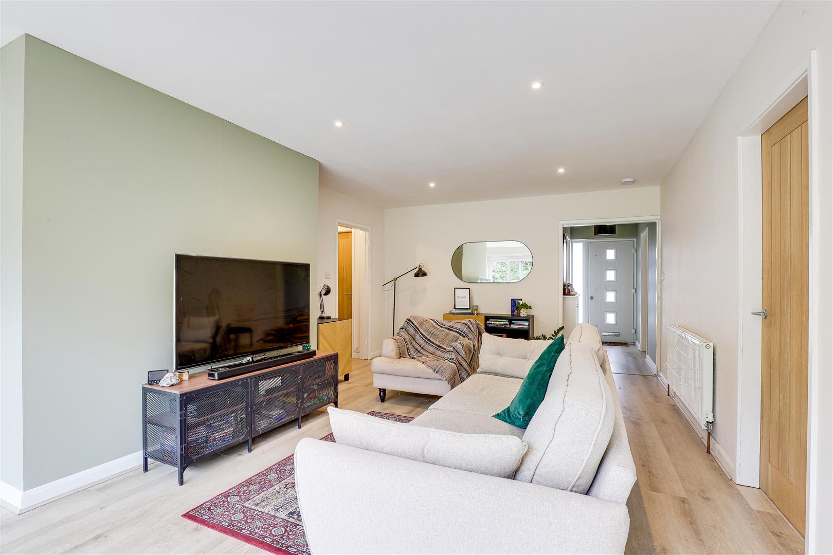 The living room has laminate flooring, two radiators, recessed spotlights and UPVC sliding patio doors out to the garden.