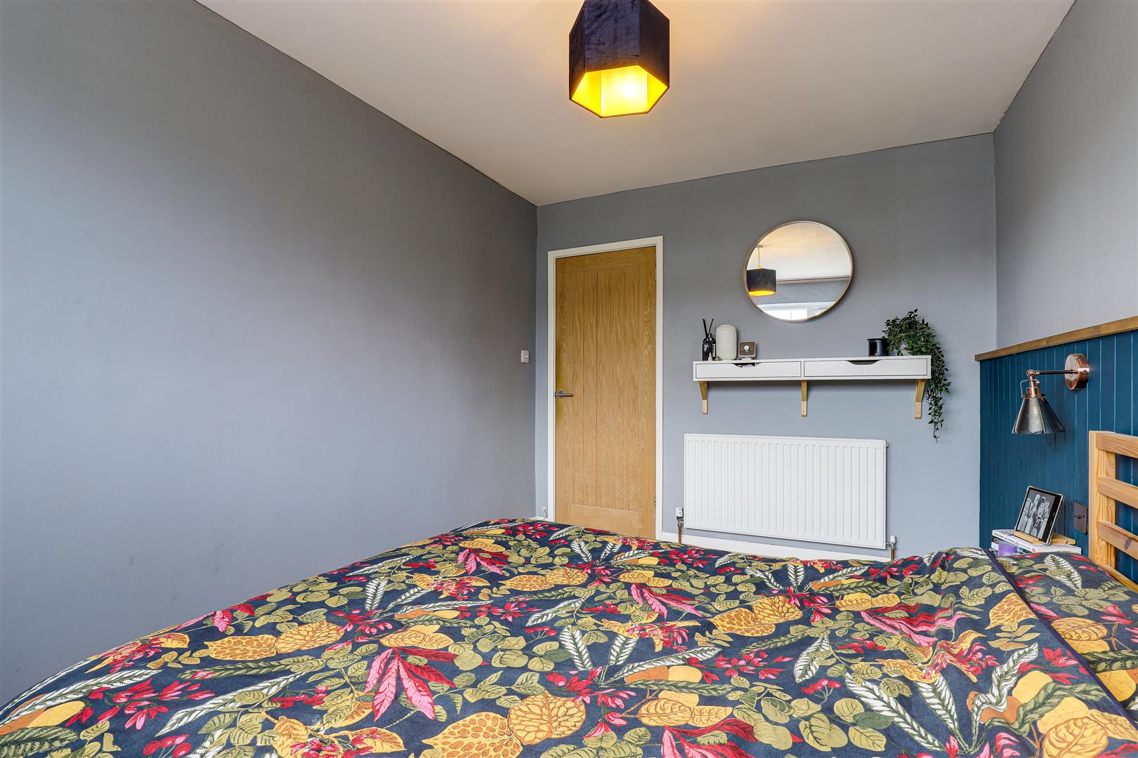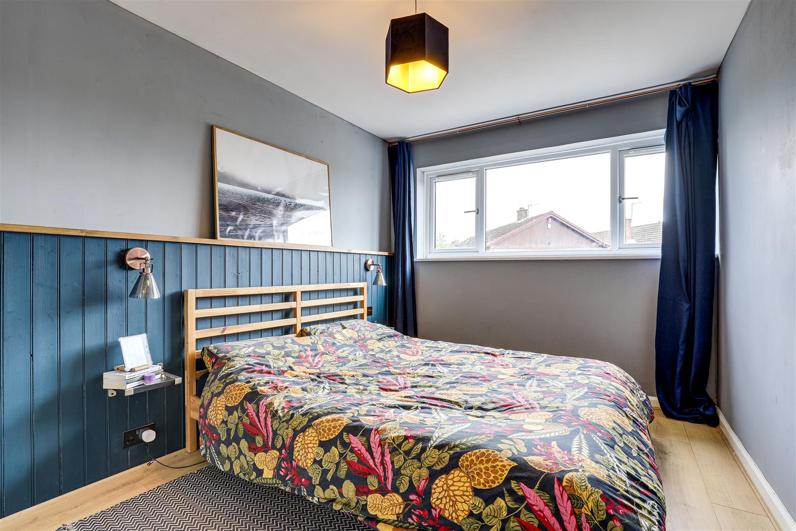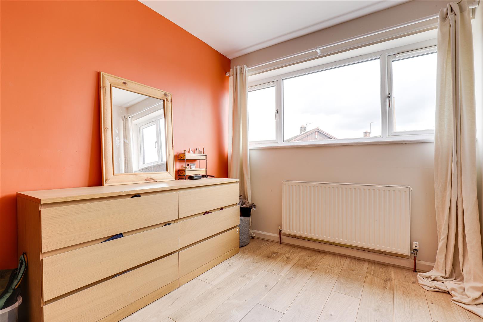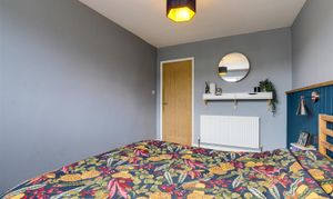 The main bedroom has a UPVC double-glazed window to the front elevation, laminate flooring, a radiator, a panelled feature wall and wall-mounted light fixtures.