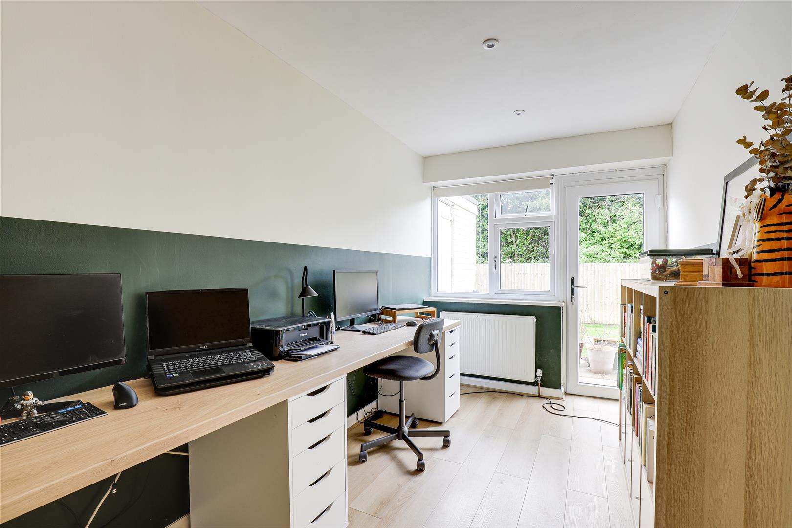 The second bedroom has a UPVC double-glazed window to the rear elevation, laminate flooring, a radiator, recessed spotlights and a UPVC single door providing access out to the garden.
