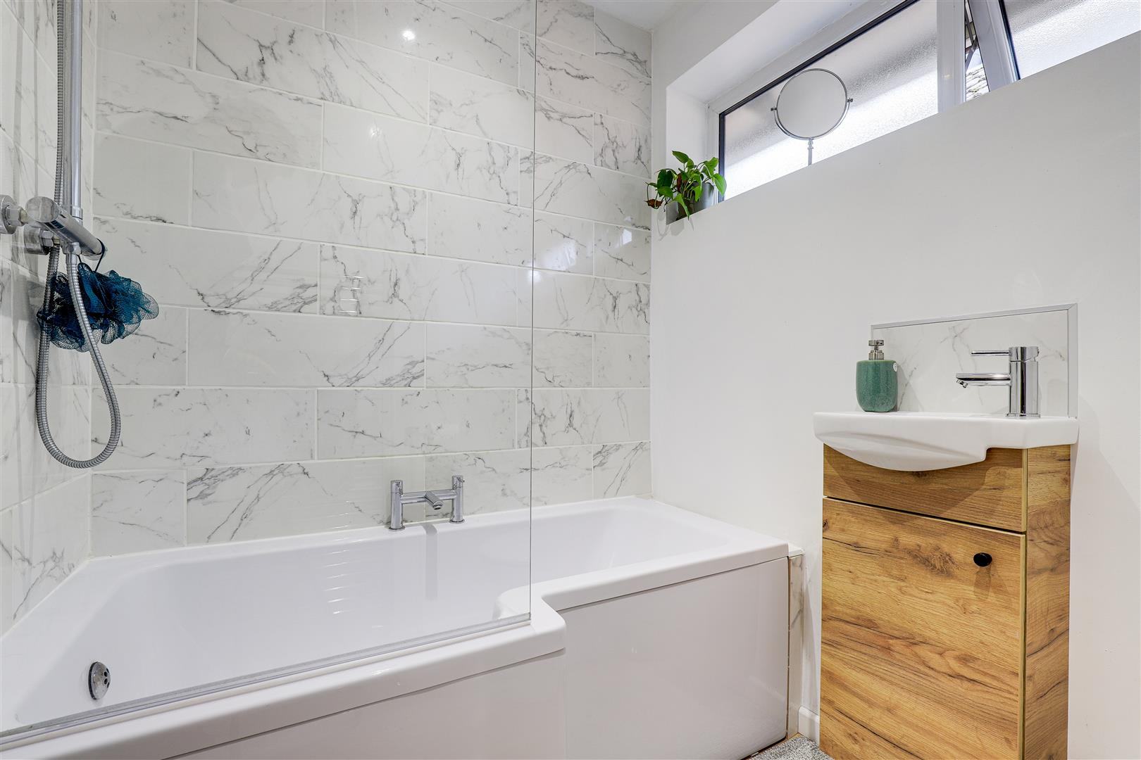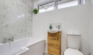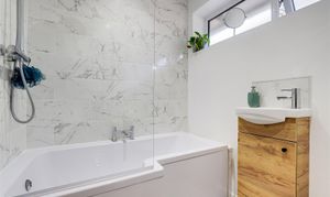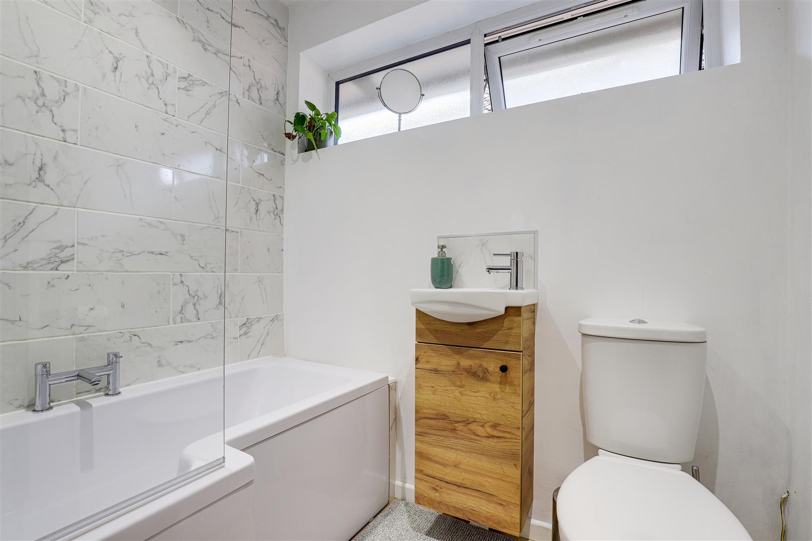 The bathroom has a low level flush W/C, a vanity style wash basin, a fitted panelled bath with a mains-fed over the head rainfall shower, hand-held shower and a glass shower screen, laminate flooring, partially tiled walls, a chrome heated towel rail, recessed spotlights, an extractor fan and a UPVC double-glazed obscure window to the side elevation.