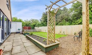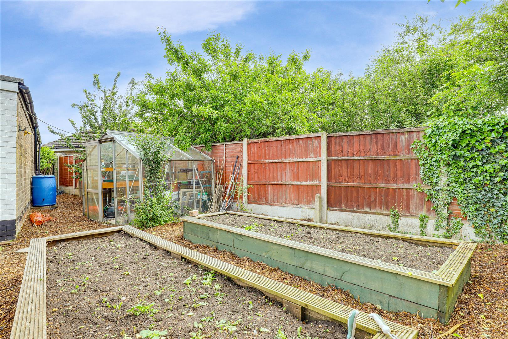 To the rear is a private south-facing garden with a fence panelled boundary, a paved patio, a lawn, bark chippings, raised planters, a greenhouse and an outdoor tap.