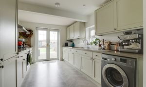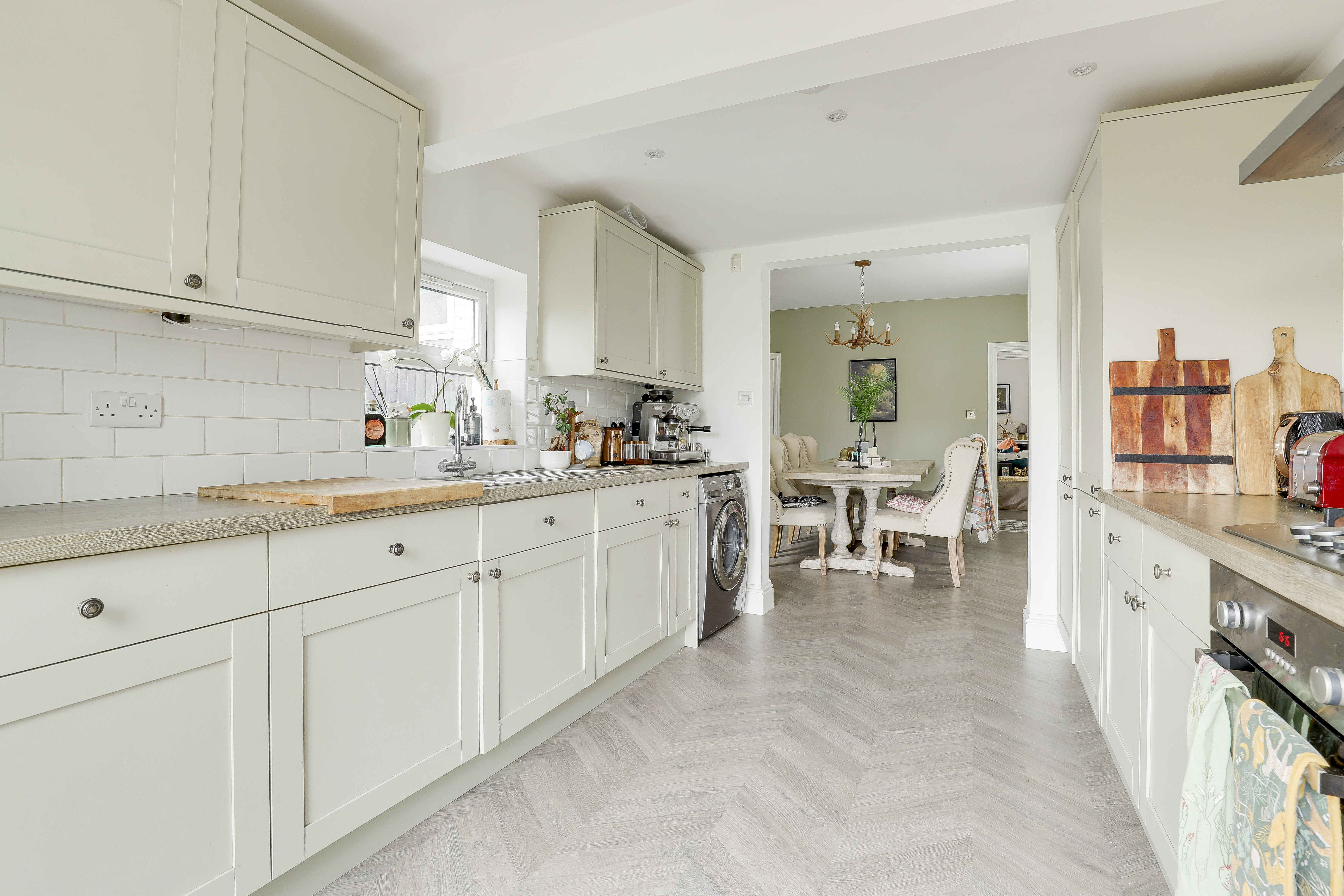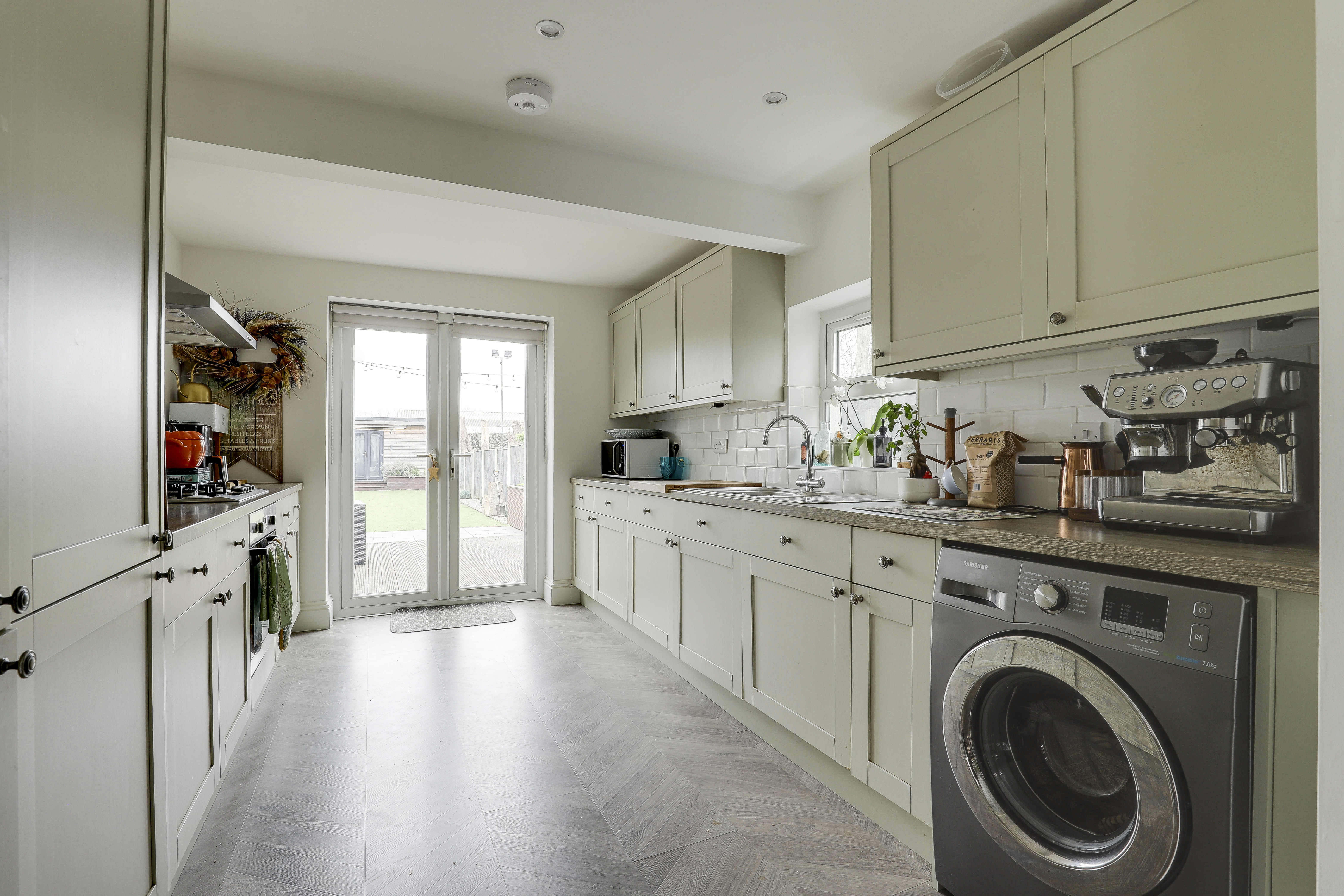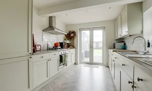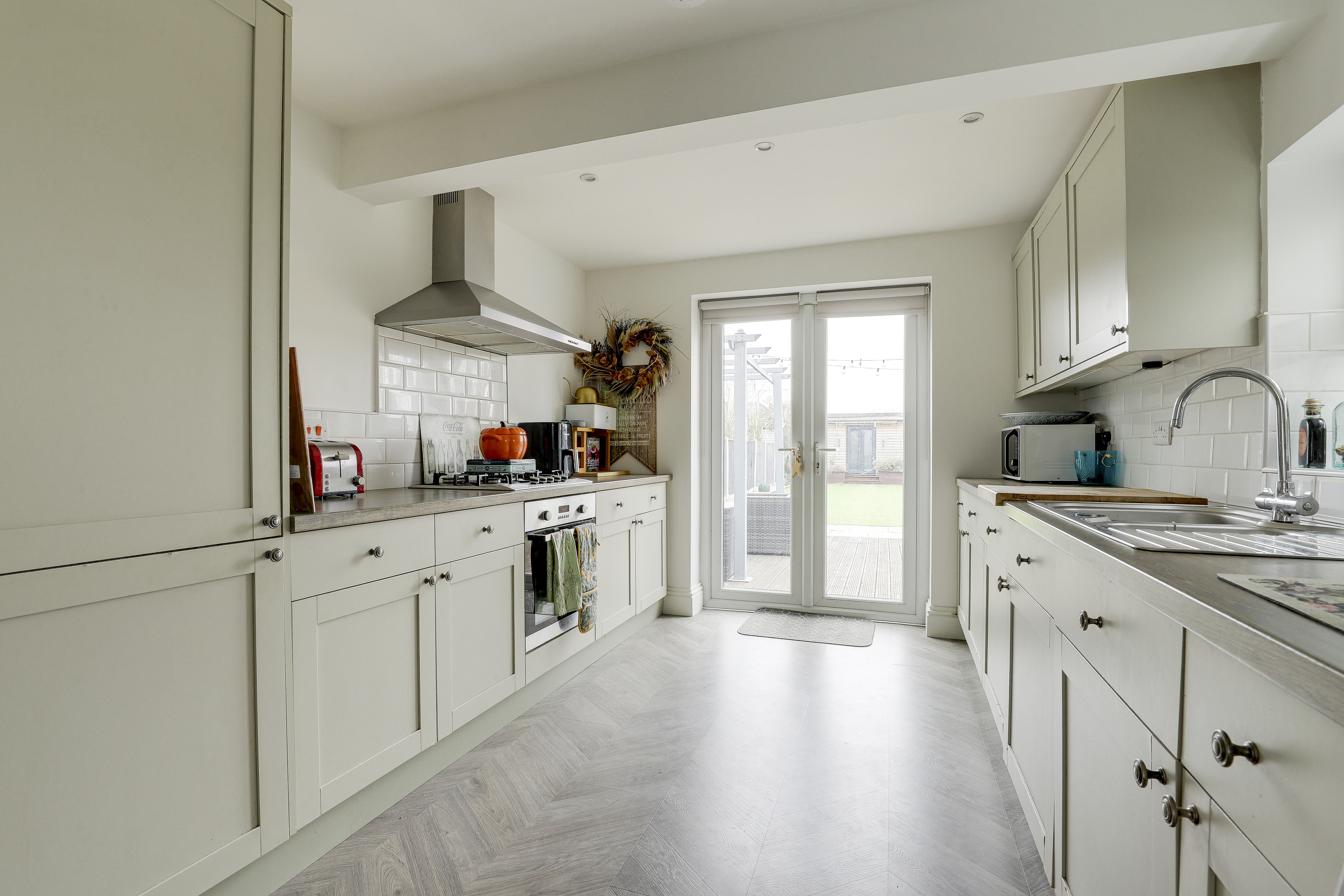 The kitchen has a range of fitted base and wall units with worktops and under cabinet lighting, a stainless steel sink and a half with mixer taps and drainer, an integrated oven with a five ring gas hob and extractor fan, an integrated fridge freezer, space and plumbing for a washing machine, tiled splash back, wood-effect flooring, recessed spotlights, a UPVC double glazed window to the side elevation and double French doors opening out to the rear garden.