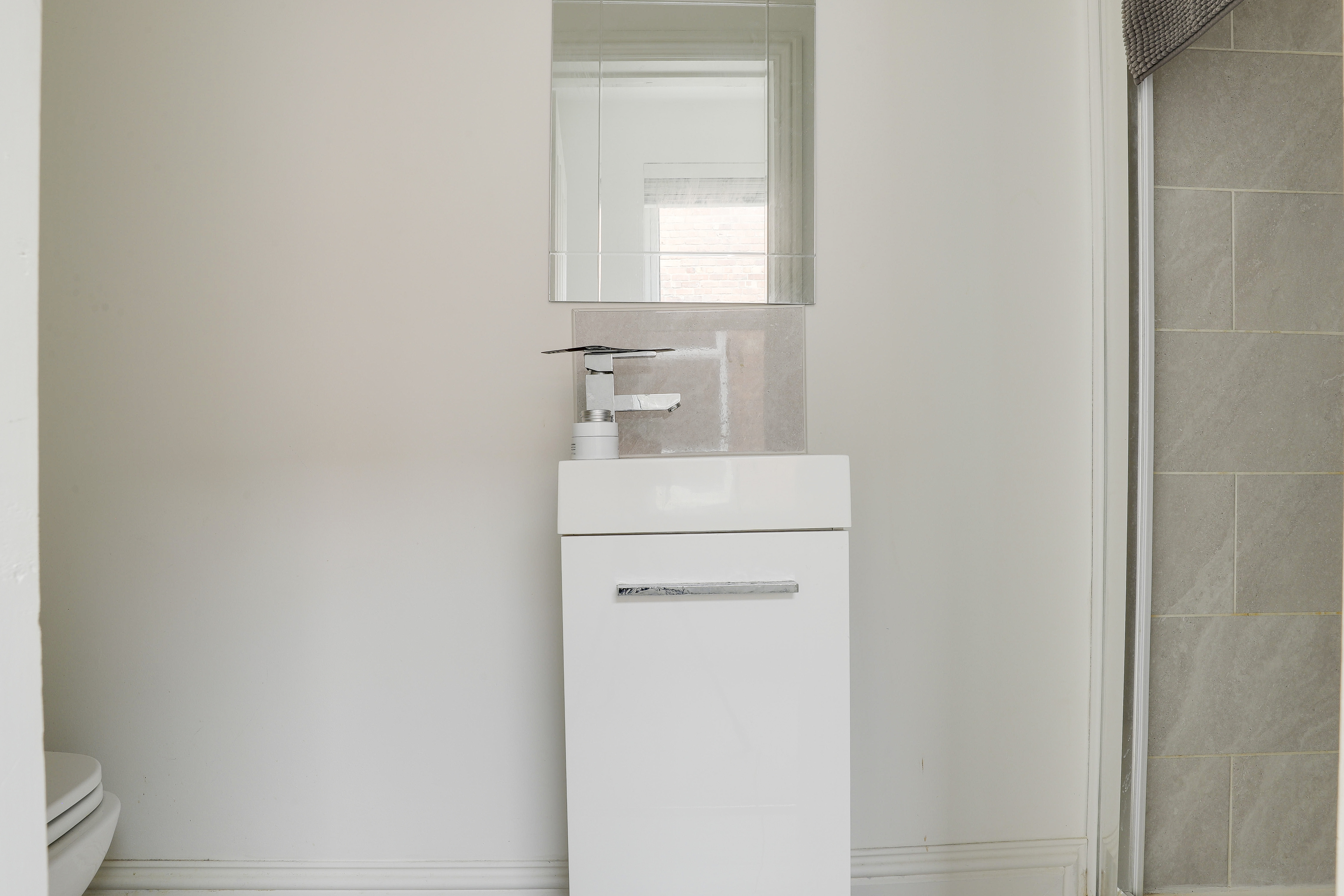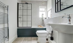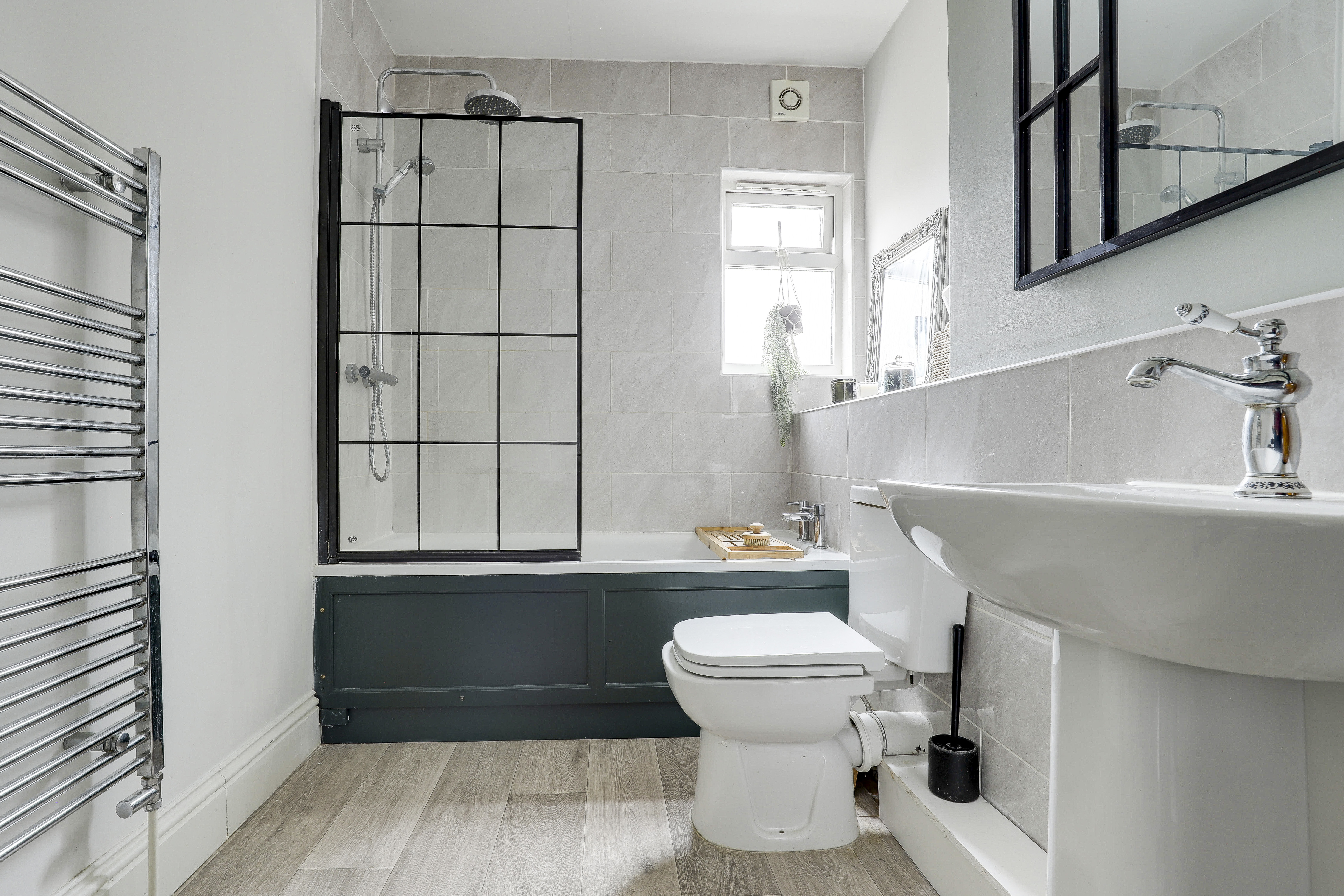 The bathroom has a low level dual flush W/C, a pedestal wash basin with a mono mixer tap, a panelled bath with an overhead rainfall shower and a handheld shower head, a shower screen, a chrome heated towel rail, an in-built cupboard, wood effect flooring, partially tiled walls, an extractor fan, recessed spotlights and a UPVC double glazed obscure window to the rear elevation.