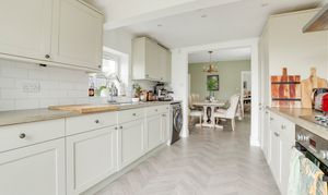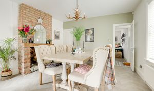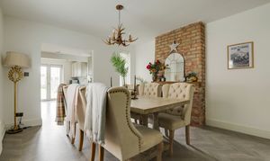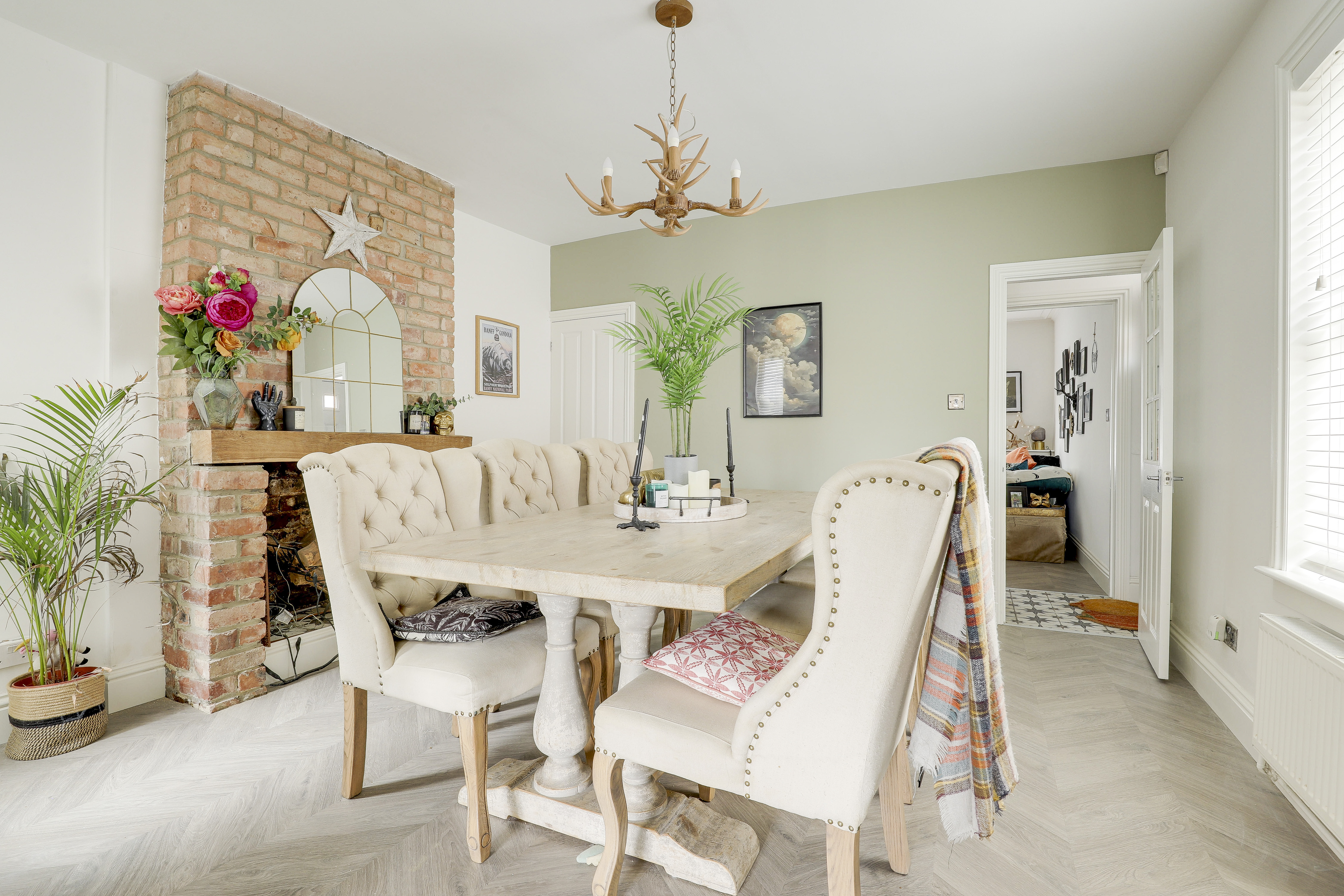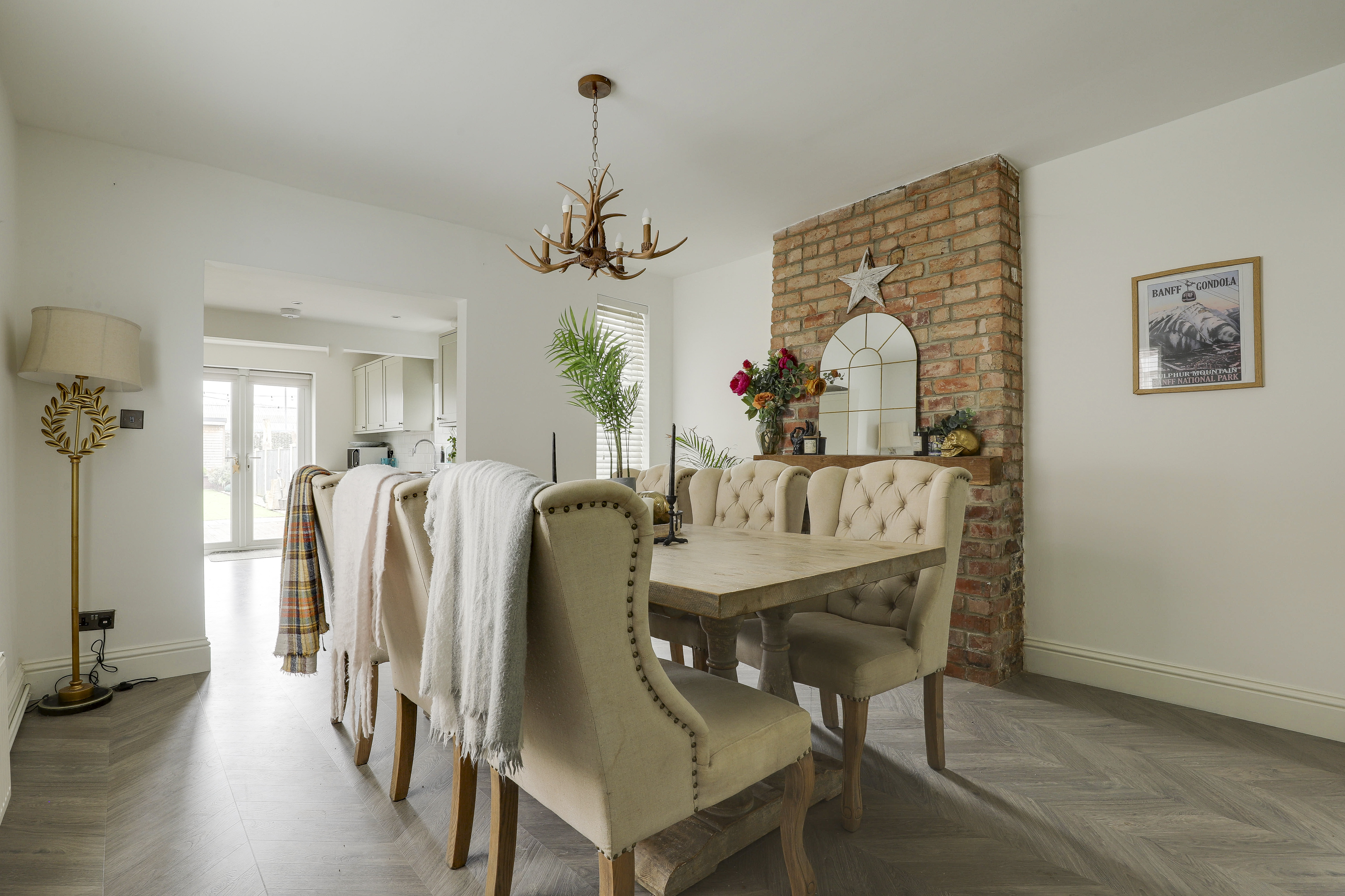 The dining room has wood-effect flooring, two radiators, a UPVC double glazed window to the side and rear elevation, an exposed brick chimney breast with a wooden mantelpiece, an in-built under stair cupboard and open access to the kitchen.