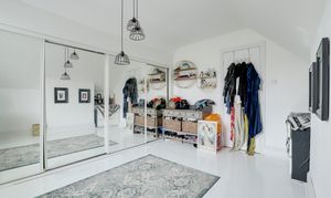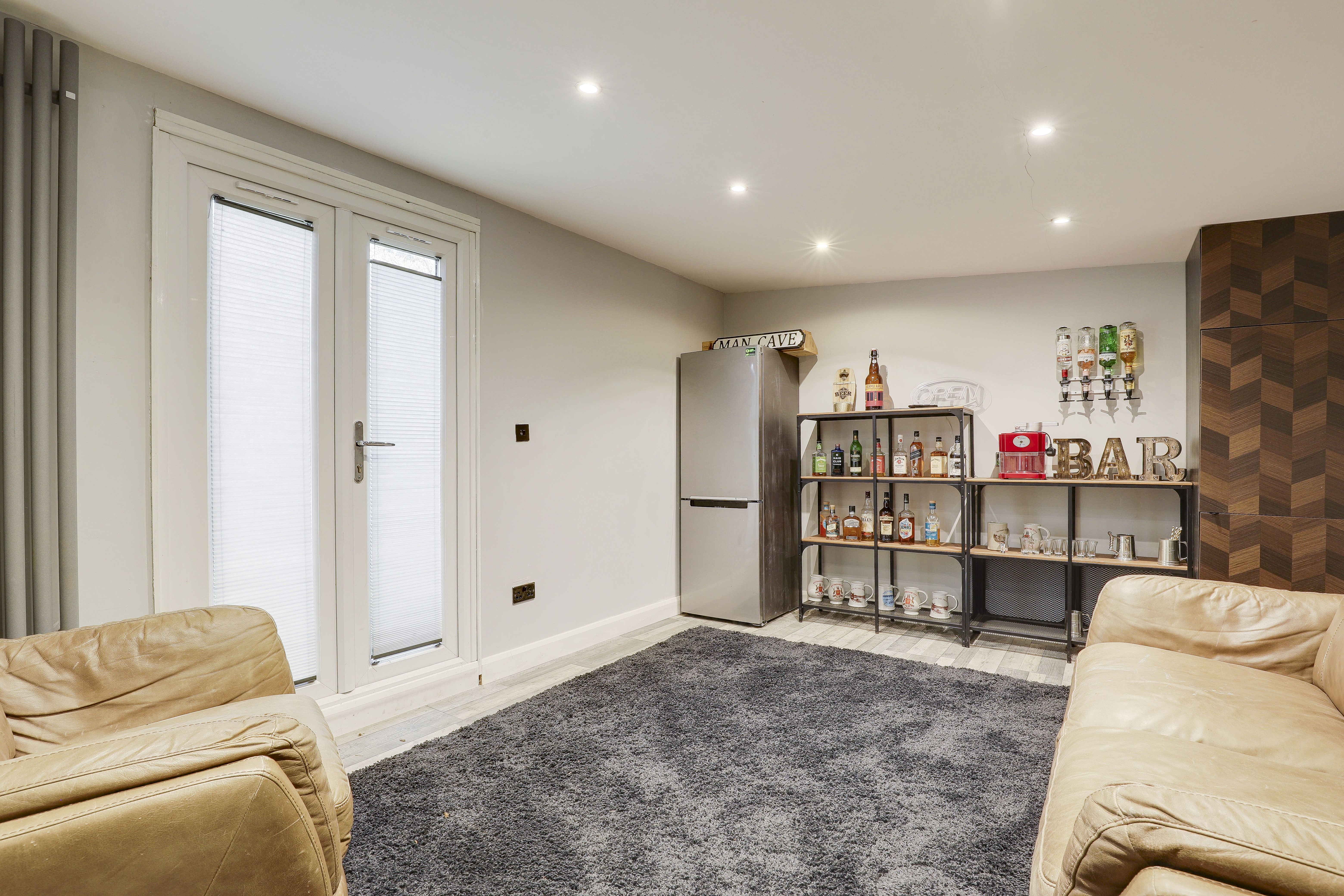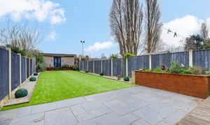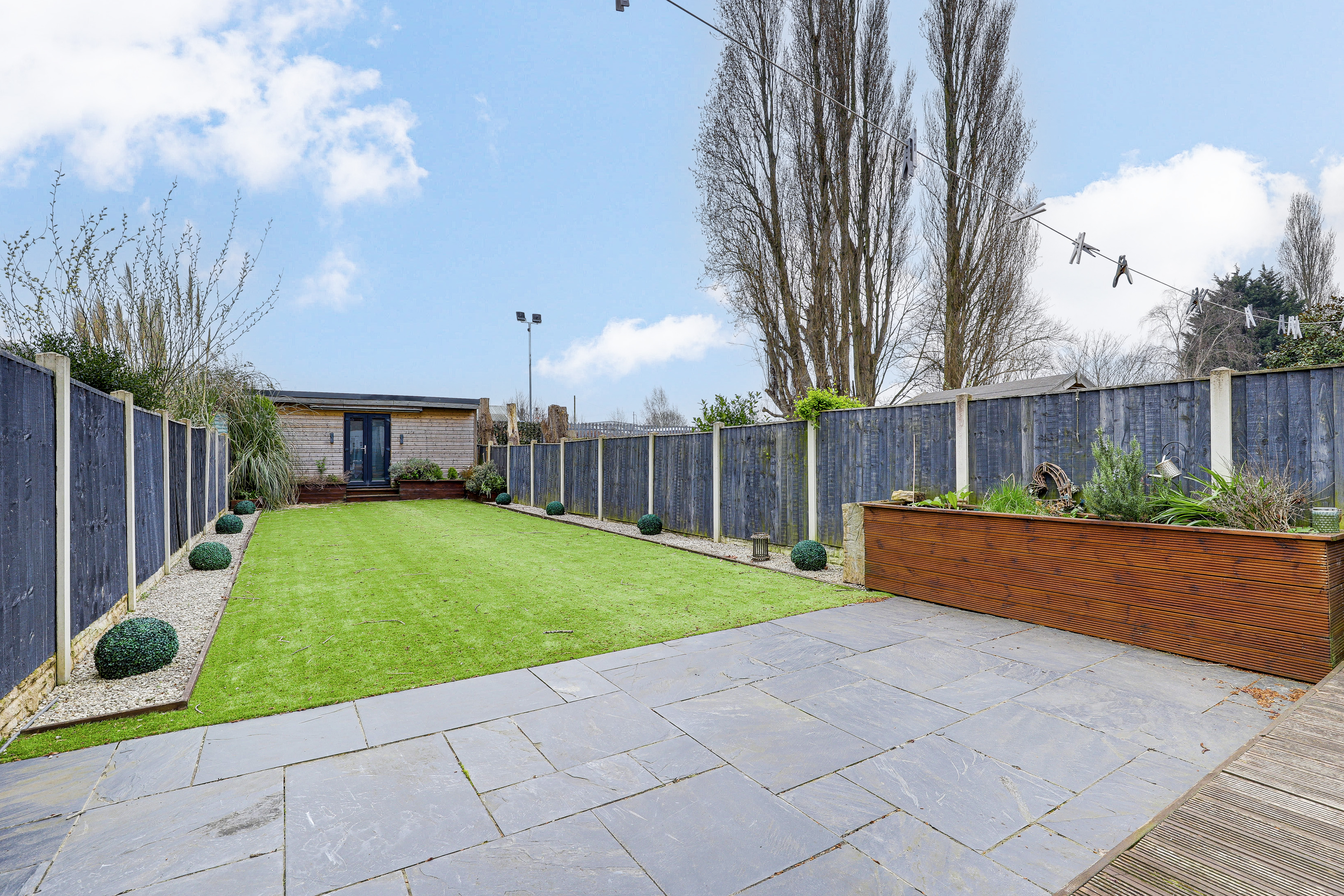 To the rear of the property is a low maintenance south-facing garden with a decked seating area, a wooden pergola, high quality artificial lawn, a versatile garden room, courtesy lighting, a gravelled border, decorative plants, fence panelling and gated access.