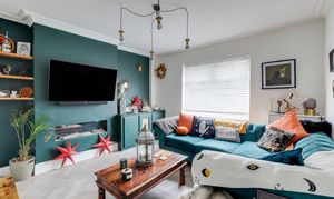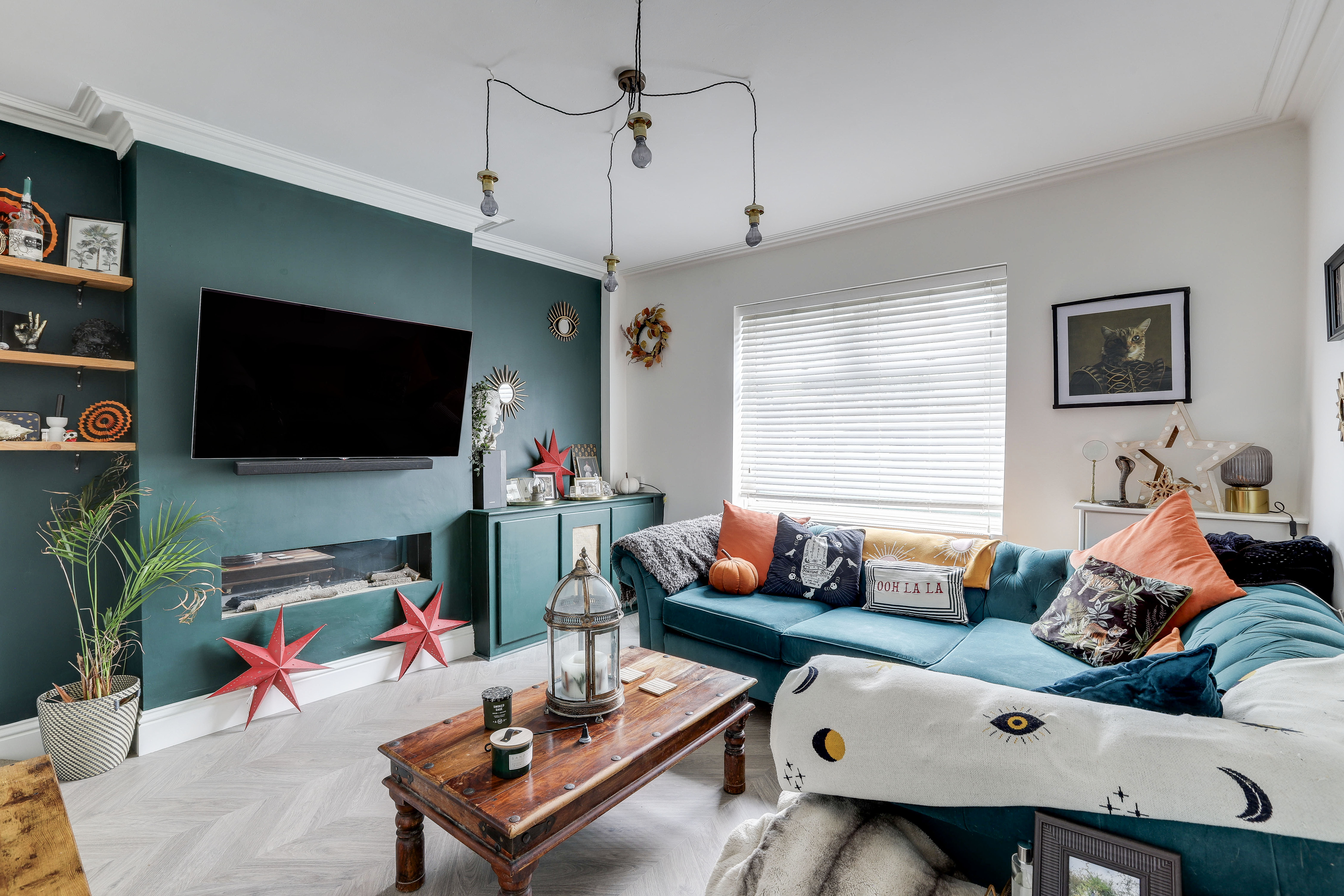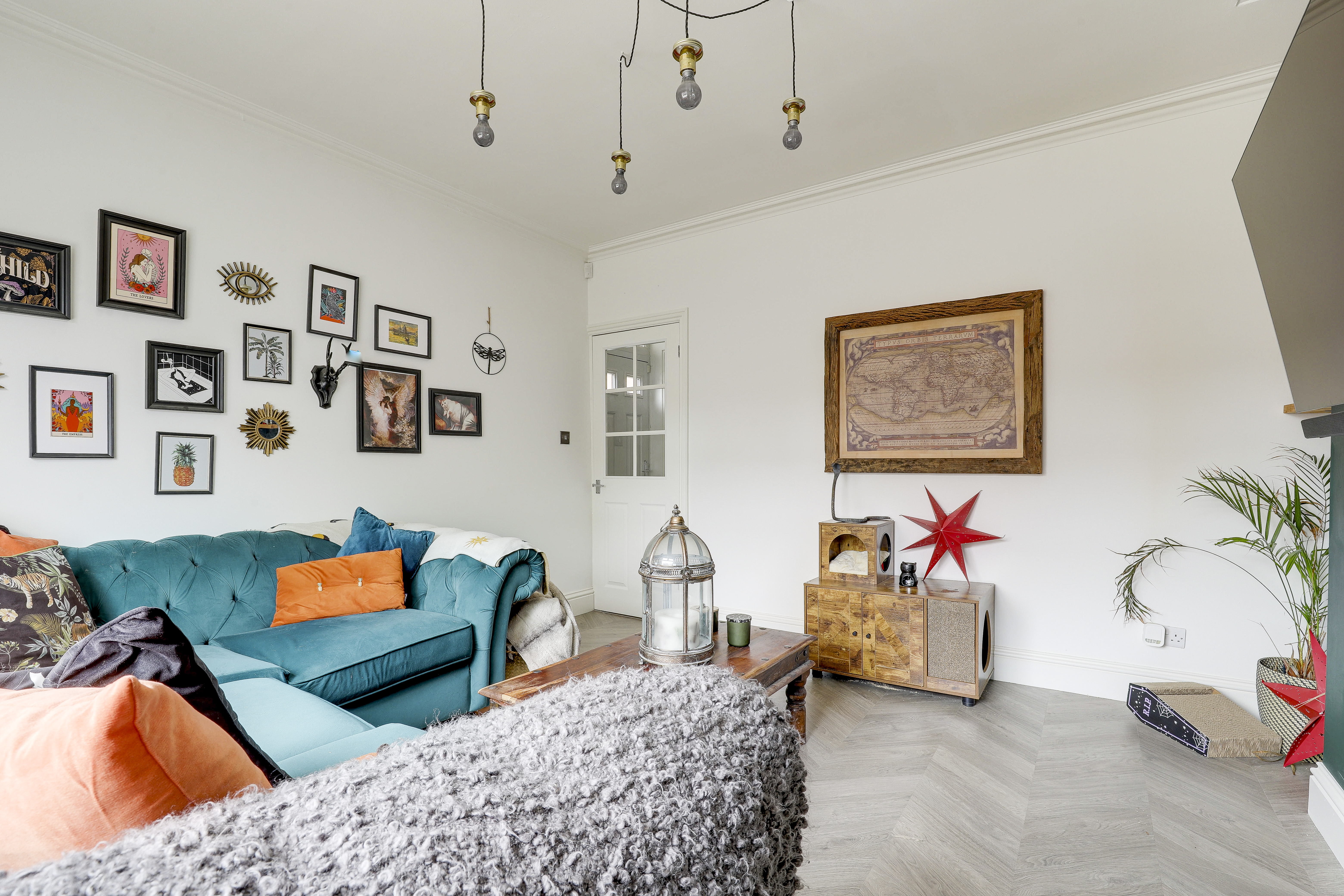 The living room has a UPVC double glazed window to the front elevation, wood-effect flooring, a radiator, original coving to the ceiling, a TV point, a recessed feature fireplace and a fitted base cupboard.