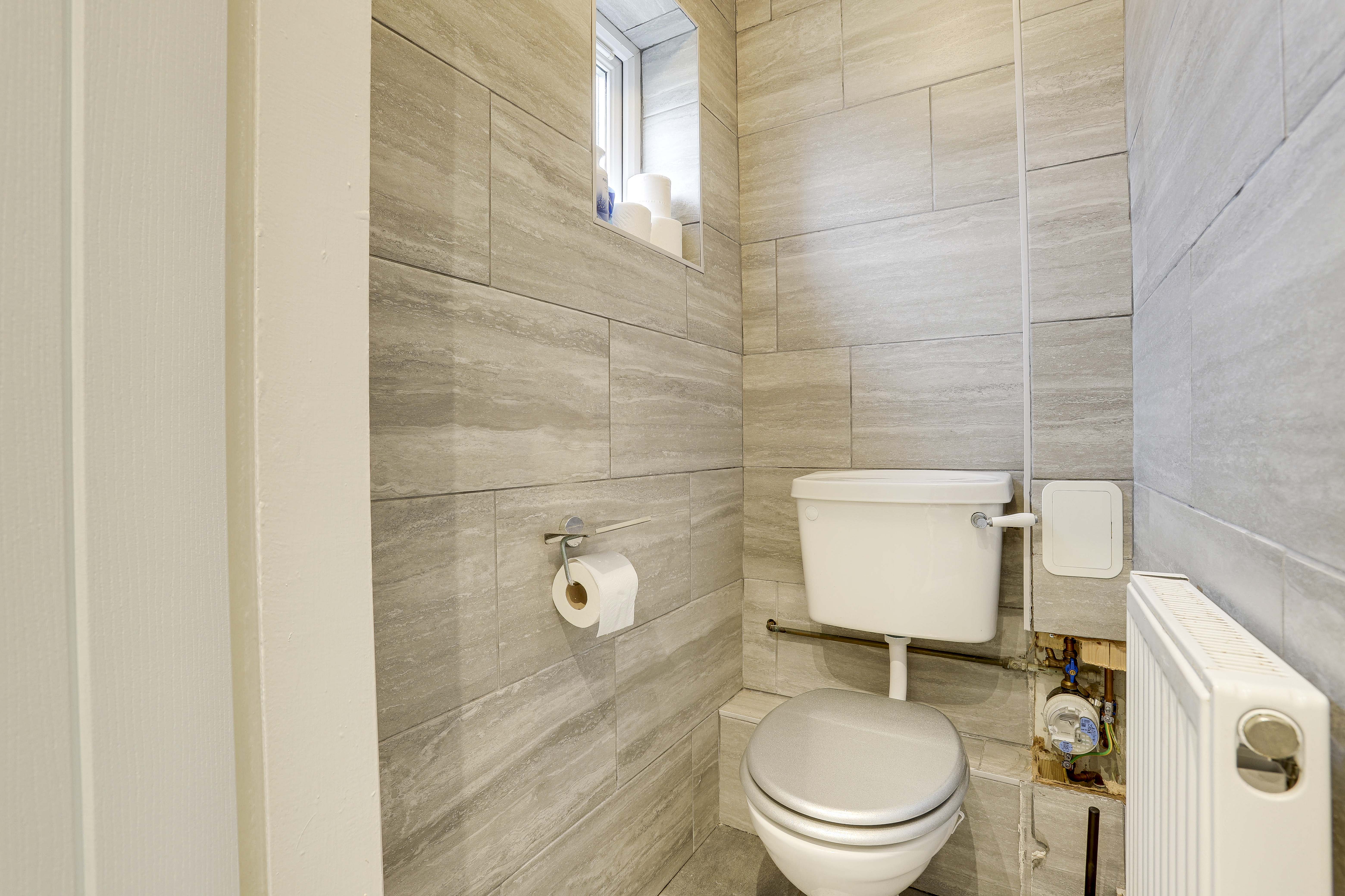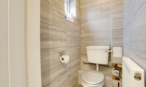 This space has a low level flush W/C, a radiator, tiled flooring, fully tiled walls, and a UPVC double-glazed obscure window to the rear elevation