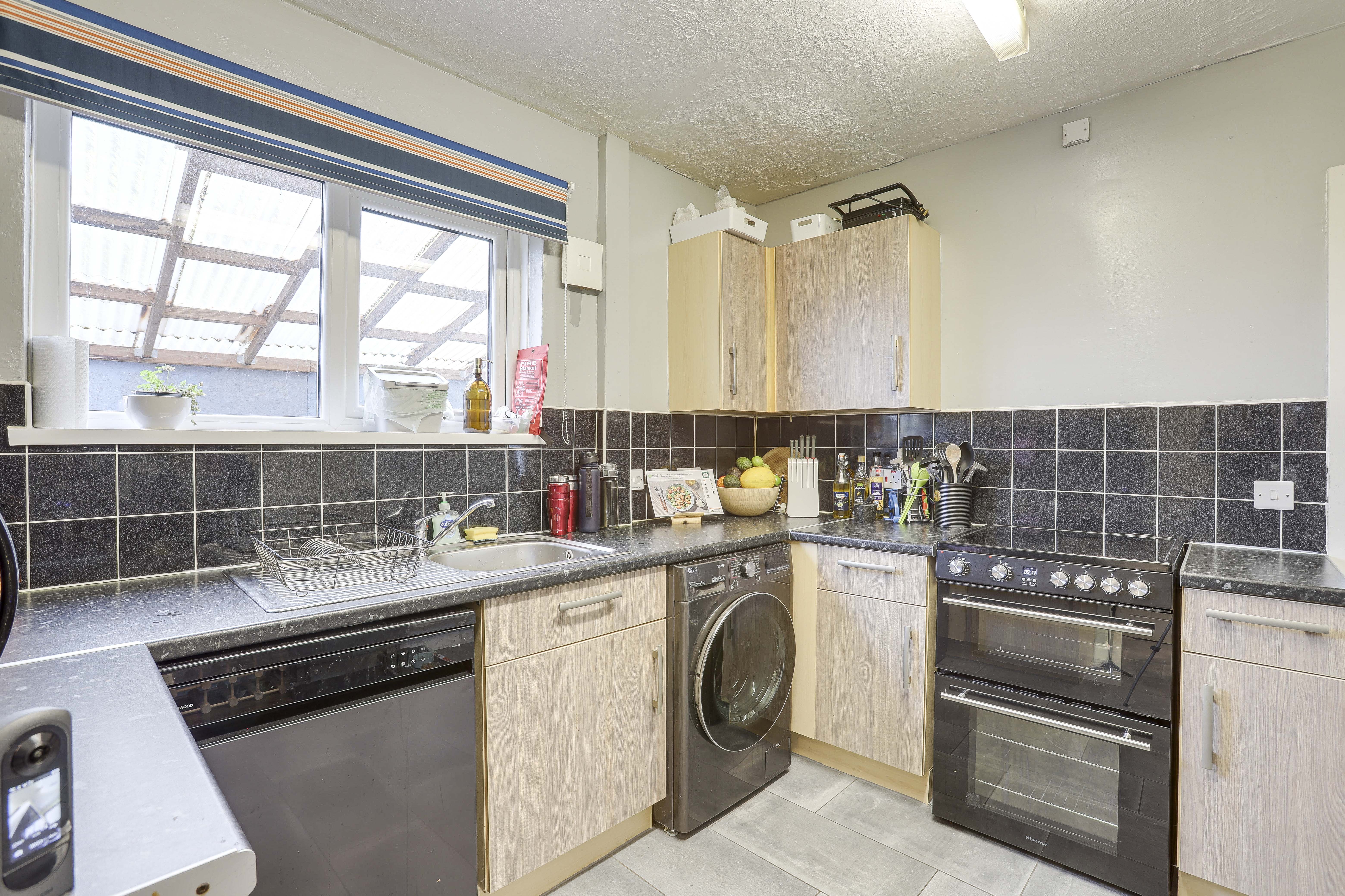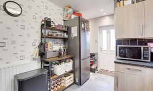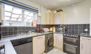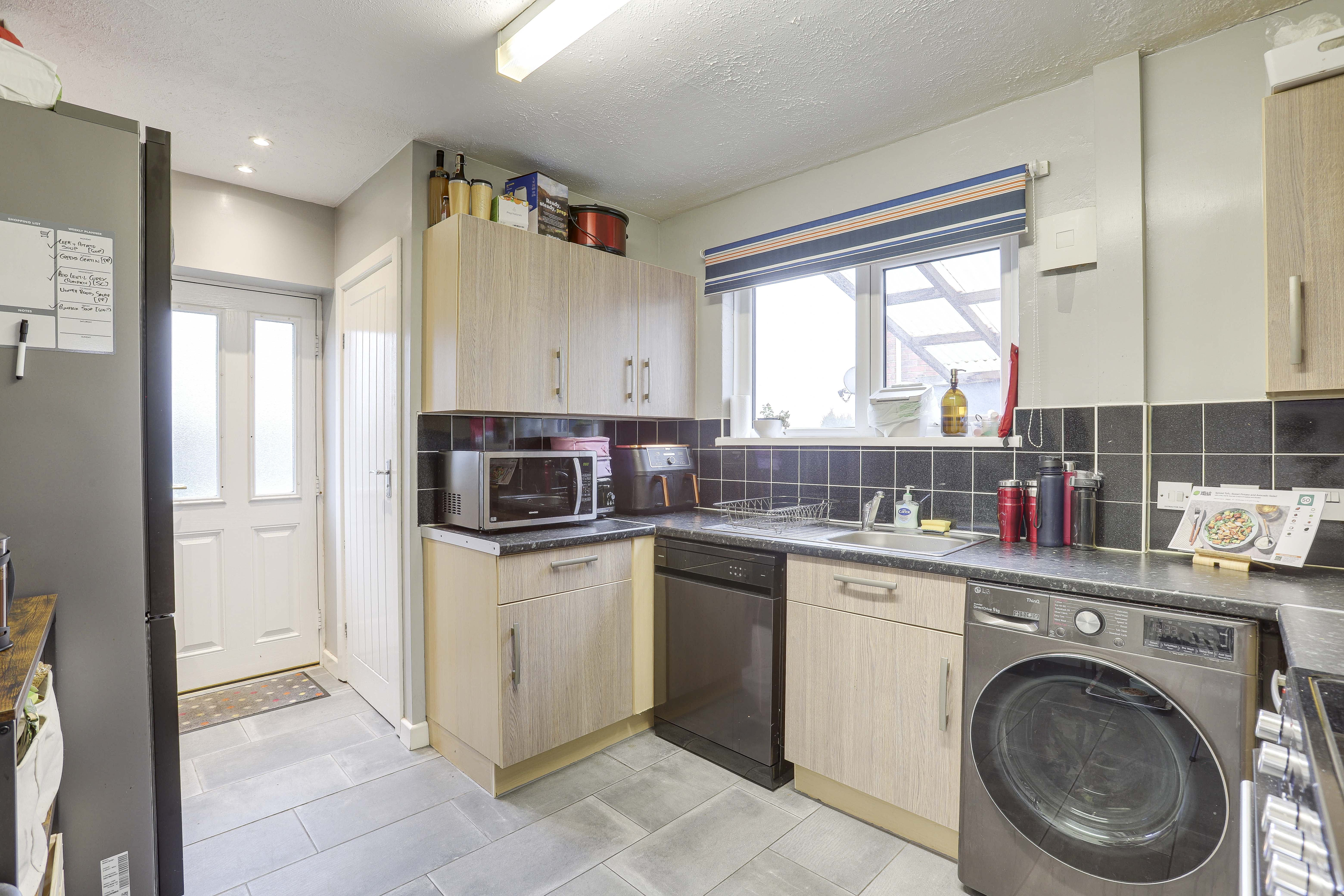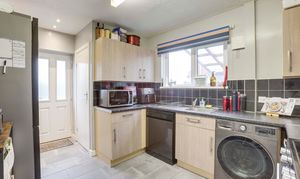 The kitchen has a range of fitted base and wall units with worktops, a stainless steel sink with a mixer tap and drainer, space for a cooker, space for a fridge freezer, space and plumbing for a washing machine and a dishwasher, tiled flooring, tiled splashback, a radiator, a UPVC double-glazed window to the side elevation, and a single composite door providing access to the garden
