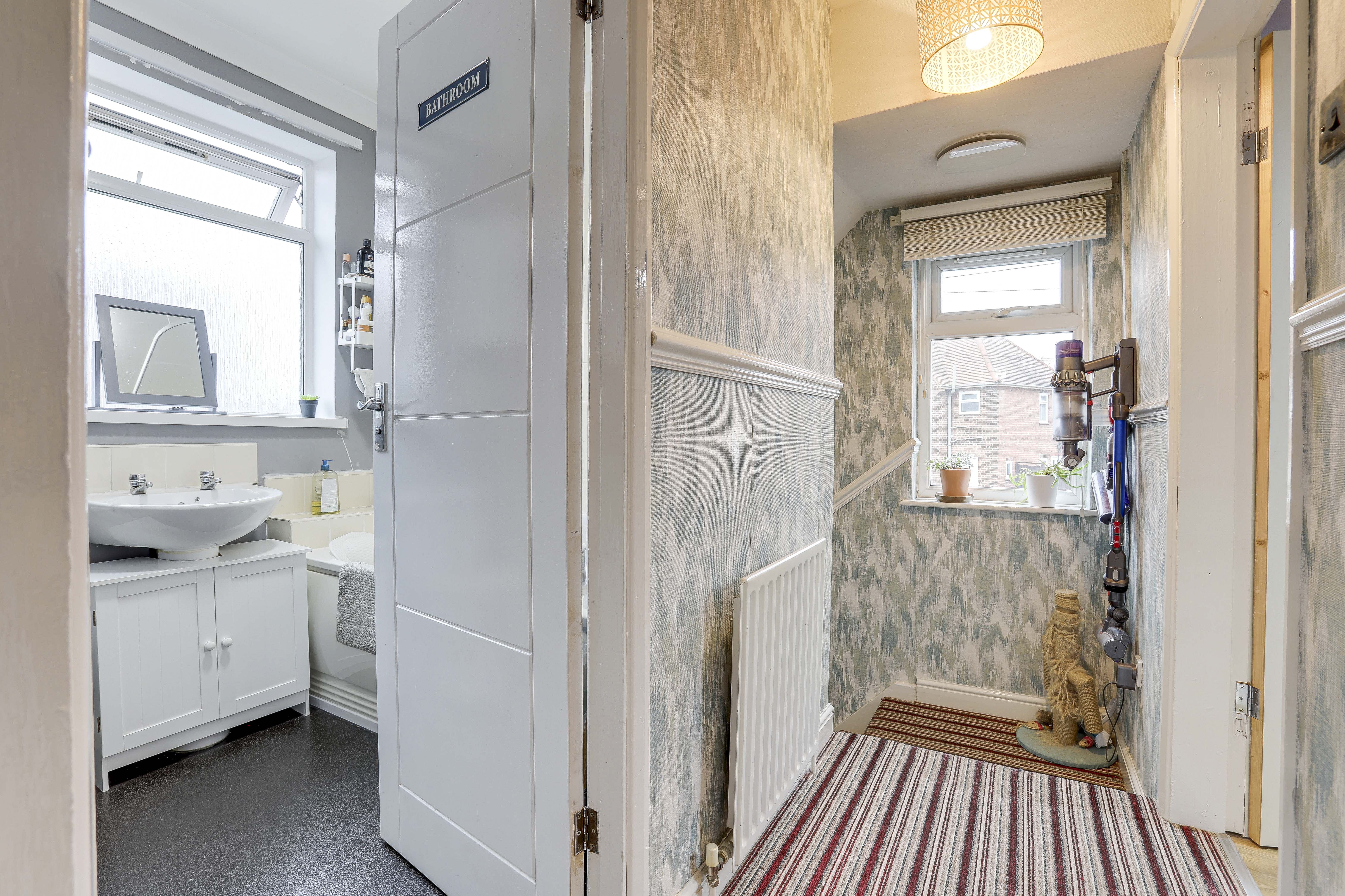 The landing has a UPVC double-glazed window to the front elevation, carpeted flooring, a radiator, a dado rail, access to the loft, and access to the first floor accommodation