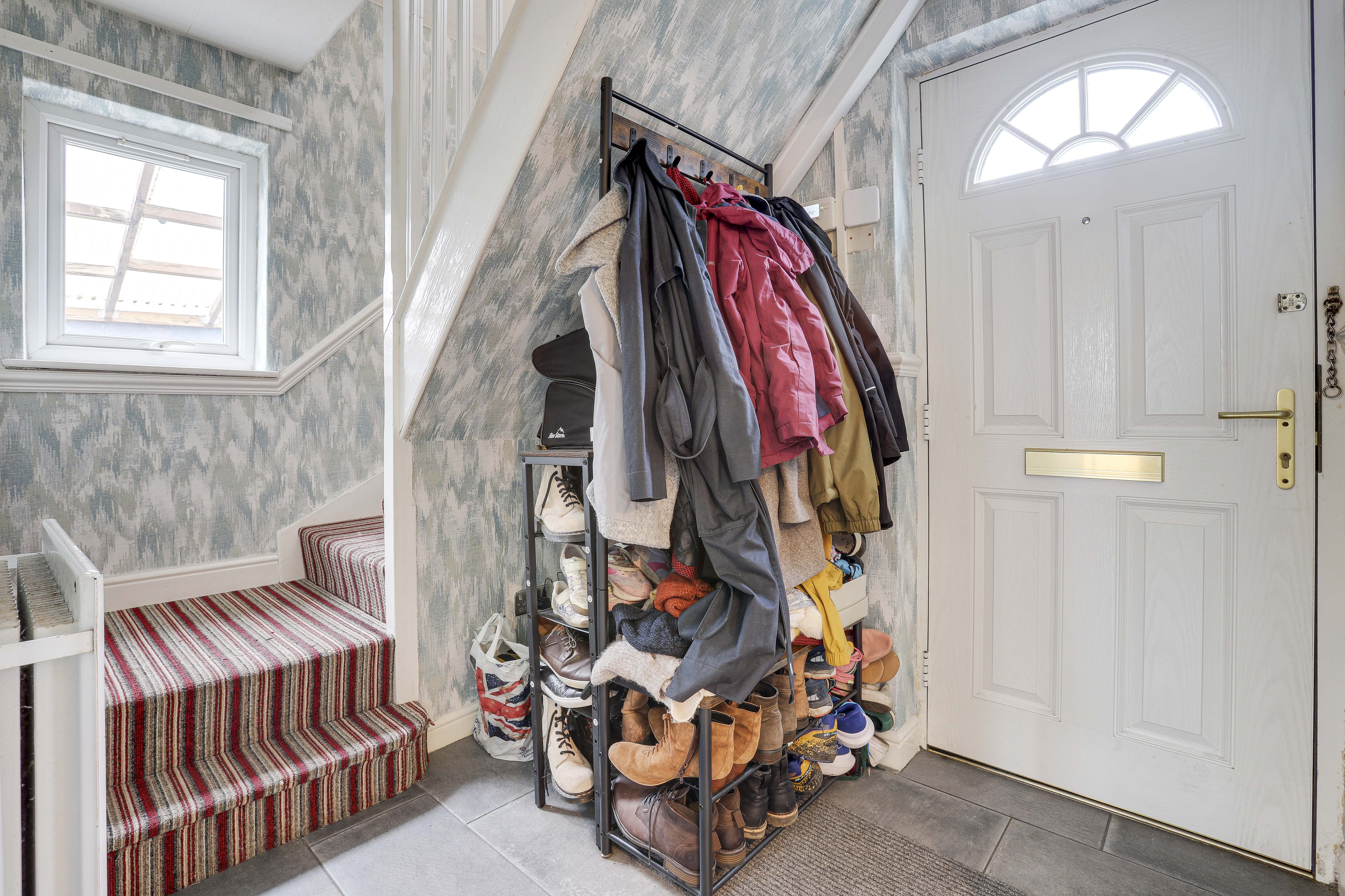 The entrance hall has tiled flooring, a dado rail, a radiator, carpeted stairs, a UPVC double-glazed window to the side elevation, and a single composite door providing access into the accommodation