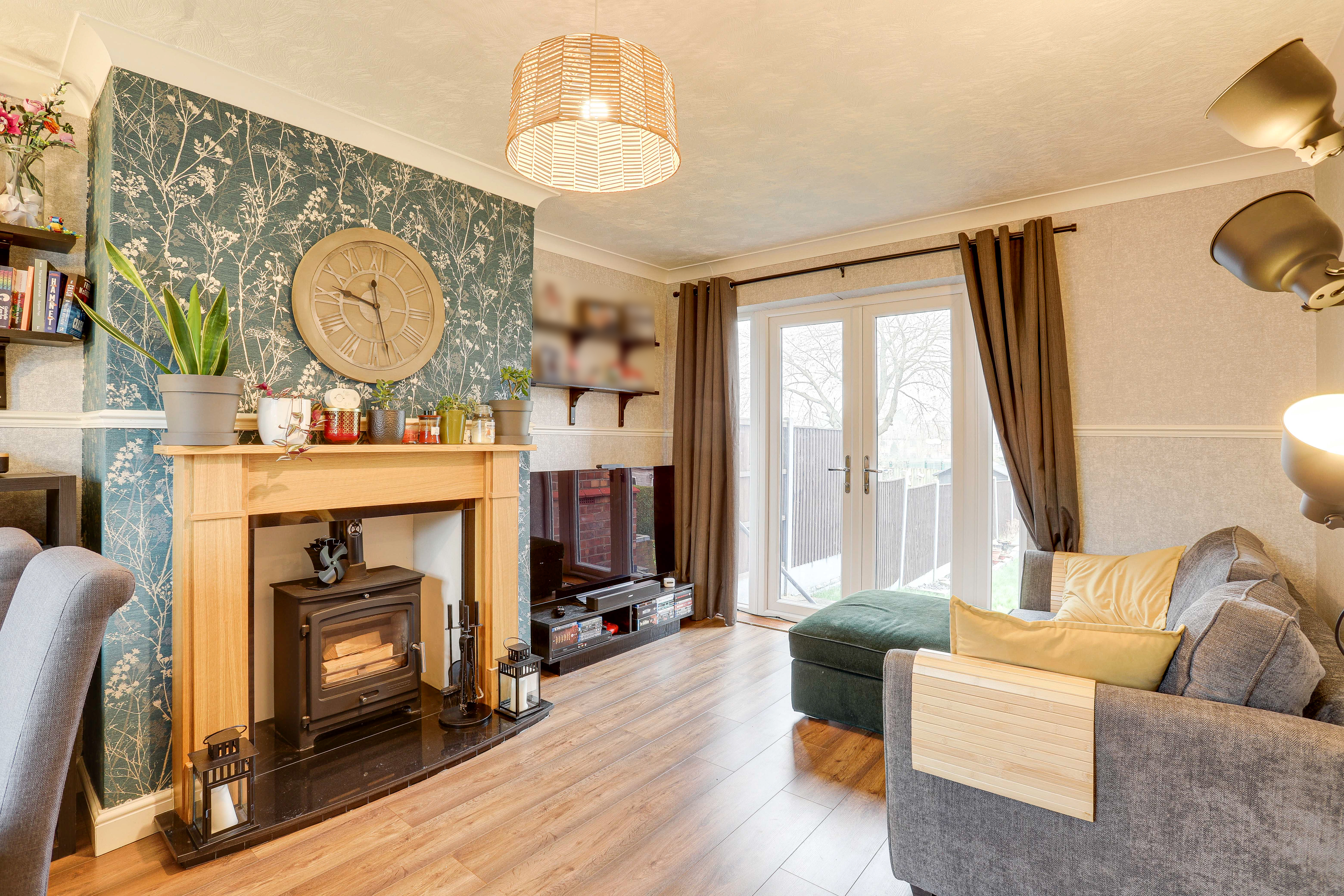 The living room has a UPVC double-glazed window to the front elevation, wood-effect flooring, a TV point, coving to the ceiling, a dado rail, a recessed chimney breast alcove with a log-burning stove, and double French doors opening out to the rear garden