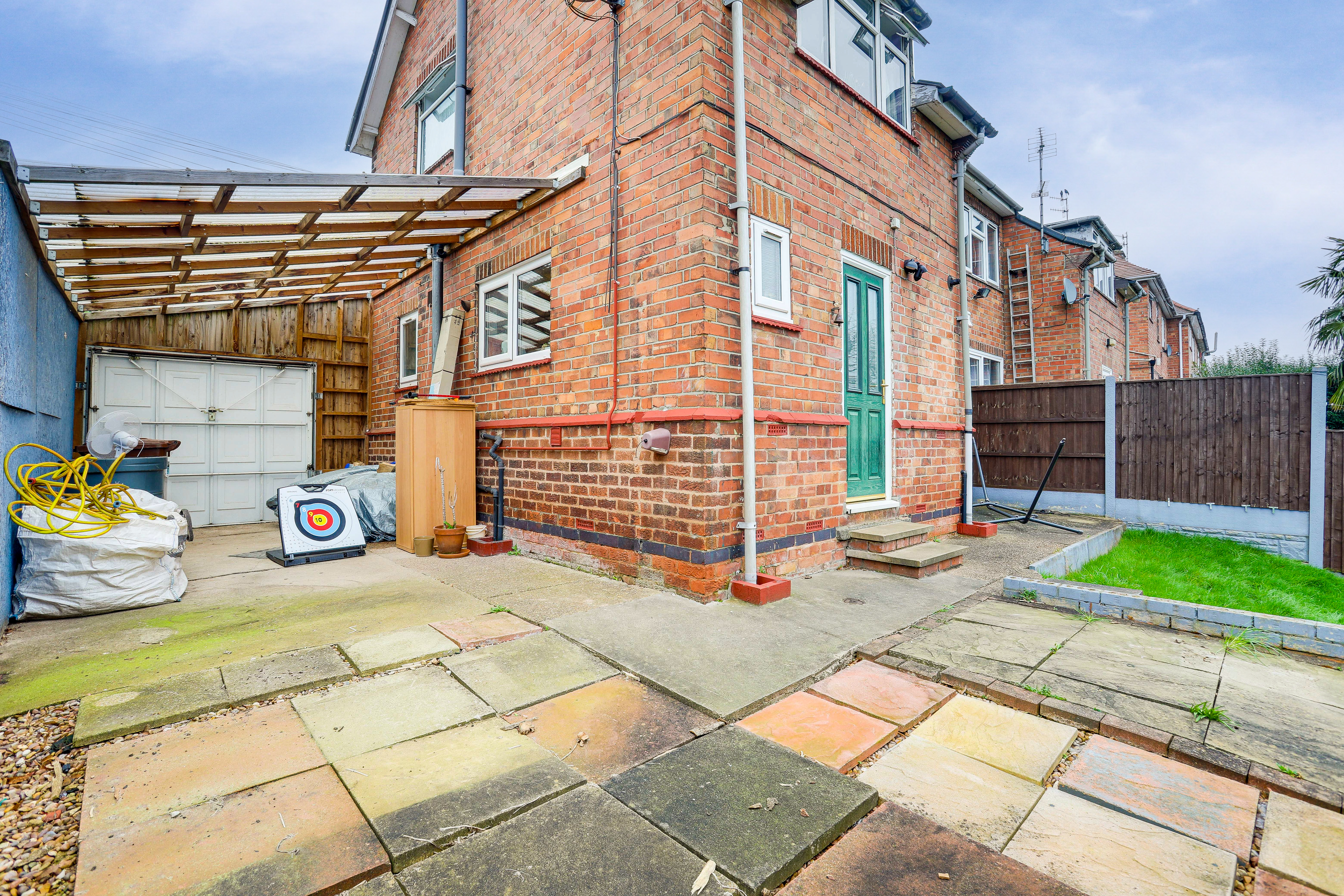 The lean-to, has a polycarbonate roof, open access to the garden and an up and over door opening out onto the front garden.