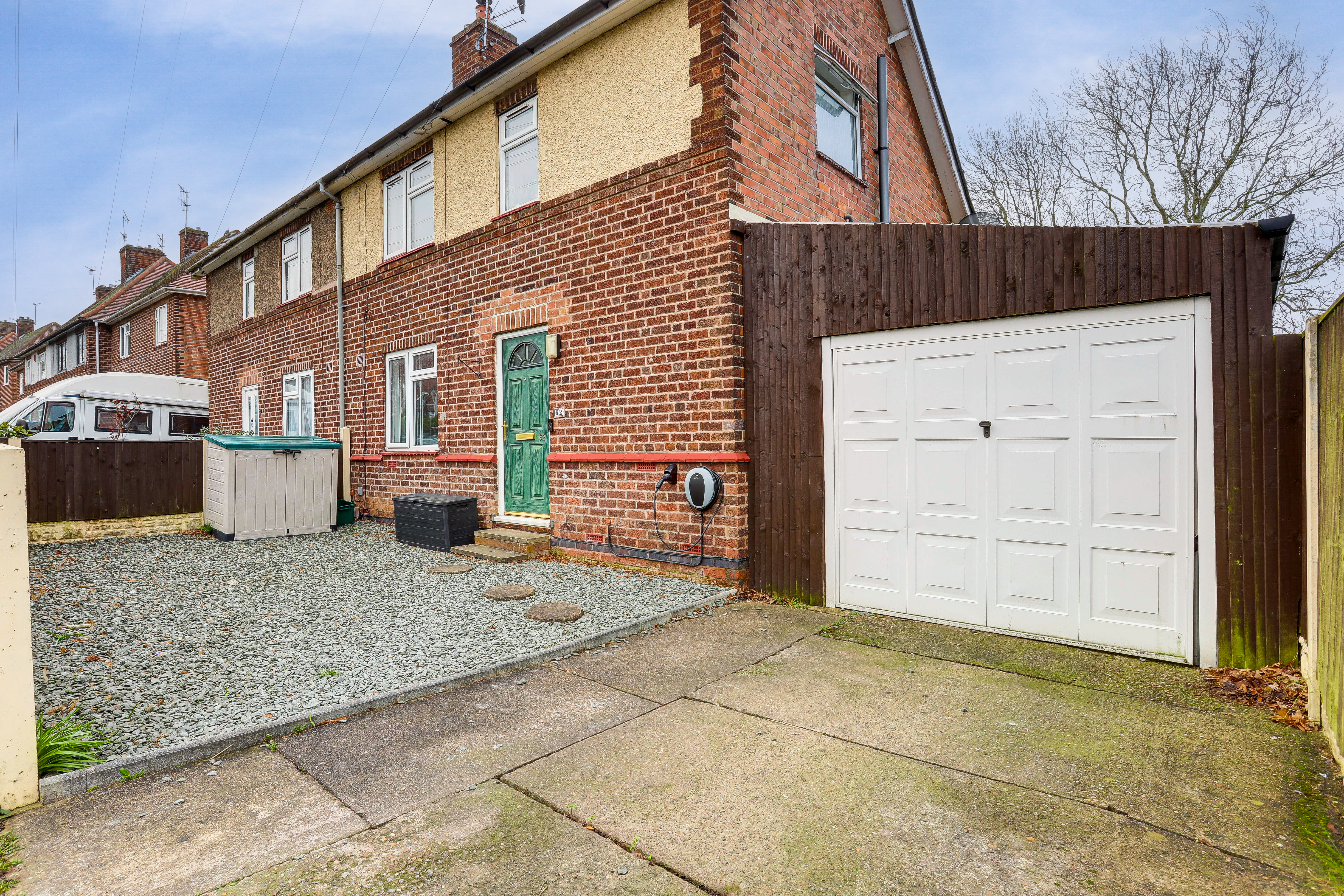 To the front of the property having access into the lean-to, and an electrical vehicle charging point.