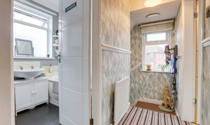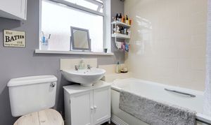 The bathroom has a low level flush W/C, a pedestal wash basin, a panelled bath with a wall-mounted electric shower fixture, partially tiled walls, a radiator, an extractor fan, coving to the ceiling and a UPVC double-glazed obscure window to the side elevation